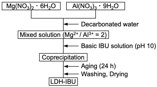 All chemicals and reagents used in this study were of analytical grade and were employed without further purification unless otherwise specified. Magnesium nitrate hexahydrate (Mg(NO3)2·6H2O) and aluminum nitrate nonahydrate (Al(NO3)3·9H2O) were purchased from Nacalai Tesque, Inc. (Kyoto, Japan) Special-grade potassium hydroxide (KOH) was obtained from FUJIFILM ko Pure Chemical Industries, Ltd. (Osaka, Japan) Ibuprofen (2-(4-isobutylphenyl)propionic acid, C13H18O2) was supplied by Tokyo Kasei Kogyo Co., Ltd. (Tokyo, Japan) Additionally, 1 M Tris-HCl buffer (pH = 7.6) and 2 M hydrochloric acid (HCl) were obtained from Nacalai Tesque Inc. Poly(methyl methacrylate) (PMMA), (C5H8O2)n, was sourced from FUJIFILM Wako Pure Chemical Corporation. The solvents used were acetone (CH3COCH3), N,N-dimethylformamide (DMF, HCON(CH3)2), and tetrahydrofuran (THF, C4H8O), all purchased from Kishida Chemical Co., Ltd. (Osaka, Japan) Ethyl acetate (CH3COOC2H5) was provided by Kanto Chemical Co., Ltd. (Tokyo, Japan) Decarbonated water (DW) was prepared by boiling deionized water, followed by cooling under a nitrogen atmosphere. DW was used throughout all experimental procedures for preparation and purification.