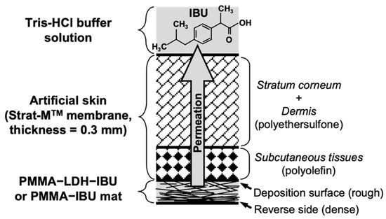 Considering the potential applications in transdermal drug delivery systems (TDDS), the release behavior of IBU through artificial skin from the fiber mats was investigated. The fiber mat was placed at the bottom with its rough deposition surface (see Figure 3) facing upward and in contact with the artificial skin. The upper part was immersed in 0.1 M Tris-HCl buffer solution (pH = 7.6), and the amounts of IBU permeated at various time intervals were quantified by HPLC (Figure 8). Consistent with the results shown in Figure 7, the release experiment using artificial skin confirmed that the intercalation of IBU into the LDH interlayer significantly increased the amount of drug released. Despite the hydrophobic and porous solid artificial skin membrane being as thick as 0.3 mm, no lag time was observed in the initial stage of IBU release. Furthermore, the release efficiency of UPMMA–LDH–IBU reached approximately 18%R after 24 h, which was nearly equivalent to the rate observed when the mats were directly immersed in the buffer solution (17%R in Figure 7c). These results suggest that IBU can rapidly diffuse through the solid–solid interface between the fiber mat and artificial skin and subsequently across the membrane, implying that the rate-limiting step in the release of IBU from the fiber mats is not within the artificial skin but rather the diffusion of IBU anions within the PMMA fibers.