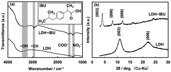 (a) FTIR spectra and (b) XRD patterns of LDH–IBU and pristine LDH. The inset in (a) shows the molecular structure of IBU.