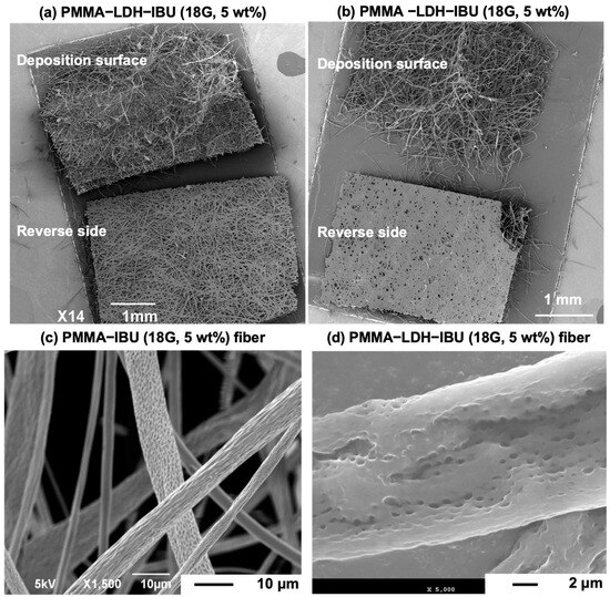 SEM images of fiber mats containing 5 wt% IBU: PMMA–IBU (a,c) and UPMMA–LDH–IBU (b,d), both prepared with 18G needles. The mats exhibited different morphologies between top and bottom surfaces, attributed to compaction of the initial deposition layer during electrospinning. Individual fibers had diameters of ~10 μm with visible surface pores, which are likely formed by delayed solvent evaporation. The inclusion of LDH–IBU enhanced fiber uniformity and improved surface features compared to PMMA–IBU.