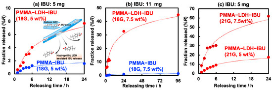 Release profiles of IBU from PMMA–IBU and UPMMA–LDH–IBU, including (a) 5% and (b) 7.5 wt% IBU formed using 18G needles, respectively. The profiles of UPMMA–LDH–IBU (21G, 5 or 7.5 wt%) are also displayed in (c). The initial amount of IBU in the fibers in (a,c) was ~5 mg, and that in (b) was ~11 mg.