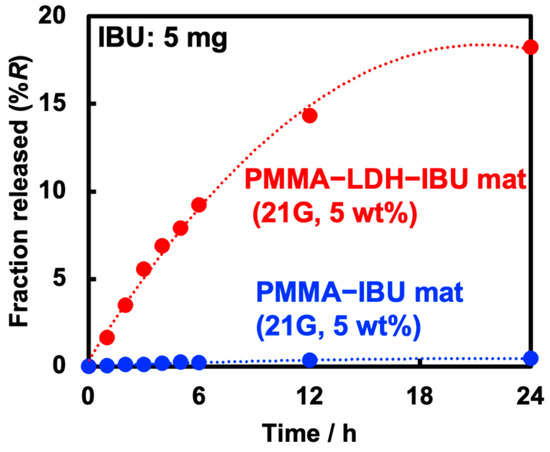 IBU release behavior of PMMA–IBU and UPMMA–LDH–IBU (21G, 5 wt%), where the total IBU amount in the mats was 5 mg.