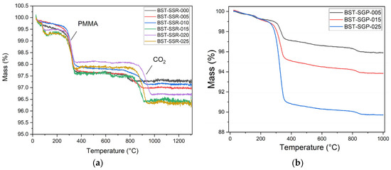 The calcination and sintering steps within the SSR and SGP were controlled by thermogravimetry. As described in Section 2.1.1, for better processing, PMMA (2 wt%) was added as a binder to support pellet pressing. Figure 2a shows the mass change with proceeding temperature treatment for SSR-synthesis. As expected, the decomposition of the added PMMA can be seen in the temperature range between 250 and 350 °C. A second mass loss around 800–900 °C up to 1.5 wt% can be observed, which can be attributed to an incomplete CO2 release during calcination according to the decomposition of the initial carbonates [37]. In the case of the SGP systems with increasing Sr content, an increasing mass loss can be observed, which can be attributed to the decomposition of strontium acetate (Tdec: 380 °C [38]) (Figure 2b). Only for the system with the highest barium acetate content, a small mass loss between 450 and 500 °C can be detected, which fits well to the decomposition temperature (450 °C) of barium acetate [39]. At low (150 °C) temperature, the acetates decompose to oxalates, which react at very high temperatures (800 °C) to carbonates and evolve CO2 [40].