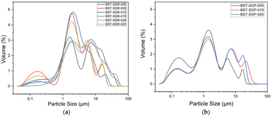 Particle size distribution of all synthesized compositions: (a) SSR; (b) SGP.