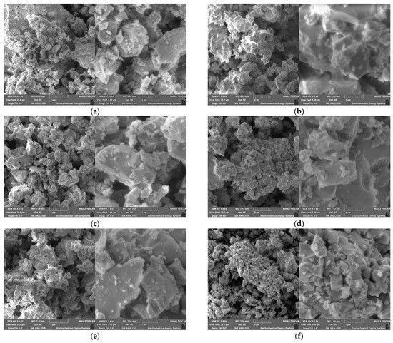 SEM images at different magnifications of all SSR synthesized powders after calcination (1000 °C, 2 h) and sintering (1300 °C, 2 h): (a) x = 0; (b) x = 0.05; (c) x = 0.1.; (d) x = 0.15; (e) x = 0.2; (f) x = 0.25.