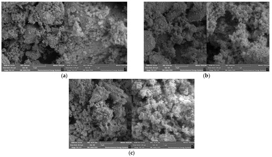 A systematic correlation between the Ba/Sr ratio on the particle’s morphology cannot be detected. For a system with x = 0.3 with a calcination temperature of 900 °C (5 h) and sintering at 1250 °C (6 h), a similar morphology is described by Nayak et al. [15]. The omission of the calcination step provides a finer morphology for different Sr-amounts [21,23,24]. A completely different morphology can be seen in the powder SEM images for the SGP-derived BSTs in Figure 5. In all three investigated compositions, a huge amount of small spherical particles attached to ones with a more irregular shape can be seen. Especially in the system with the highest strontium content, a pronounced presence of very fine particles can be observed, which coincides with the high number of small particles in the particle size distribution in Figure 3b and the larger SSA values. A similar morphology was described by Gatea and Naji under the same calcination and sintering conditions [28].