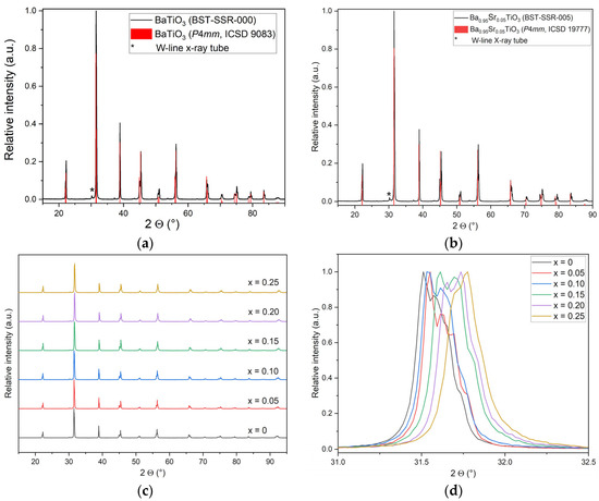 With respect to the application, it is mandatory that the proper crystal lattice, here the perovskite phase, is formed after all processing steps with respect to both synthetic routes, calcination, and sintering. Figure 6a,b show an example of the XRD pattern for BaTiO3 (x = 0) and Ba0.95Sr0.05TiO3 (x = 0.05). In addition to the experimental reflexes, the reference values from [41] for BaTiO3 (ICSD 9083) and for Ba0.95Sr0.05TiO3 (ICSD 19777) are included in Figure 6a,b. As can be seen in the diffractograms, the number and position of reflexes match the reference data quite well; no additional reflexes can be seen, which is a strong hint that the desired products are pure and no residual reactants or other phases are present. All the samples show a tetragonal symmetry with space group P4mm. While BaTiO3 exhibits a tetragonal symmetry at room temperature, pure SrTiO3 (ICSD 23076) has an ideal cubic perovskite structure with the space group P. For all investigated Ba/Sr ratios the tetragonal symmetry was preserved, which can be seen by the direct comparison of all X-ray diffractograms of the SSR synthesized BST in Figure 6c. With an increasing strontium content, a slight shift in the reflexes to higher 2θ values is observed. To show this effect clearly, Figure 6d gives a more detailed view on the most intensive reflex in the 2θ range of 30–33°. There is a difference of about a half-degree between BaTiO3 and Ba0.75Sr0.25TiO3, which can be attributed to the size differences between Sr2+ ions (r = 0.113 nm) and Ba2+ ions (r = 0.135 nm) [27]. If barium is replaced by strontium, the lattice parameters become smaller and therefore the reflexes in the diffractogram are shifted to larger angles.