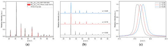 Figure 7 shows the related data for the SGP-based Ba1−xSrxTiO3 products. As an example, Figure 7a shows the XRD pattern for x = 0.05, and Figure 7b the direct comparison of all X-ray diffractograms of all SGP-synthesized BSTs. The desired products are obtained phase-pure; no remaining reactants or other phases are observed. All samples show a tetragonal symmetry at room temperature with space group P4mm. Again, with increasing strontium content, a slight shift in the reflexes to higher 2θ values can be detected (Figure 7c). From the results presented in Figure 6 and Figure 7, it can be derived that the purity of the different BSTs is identical irrespective of the applied synthetic route.