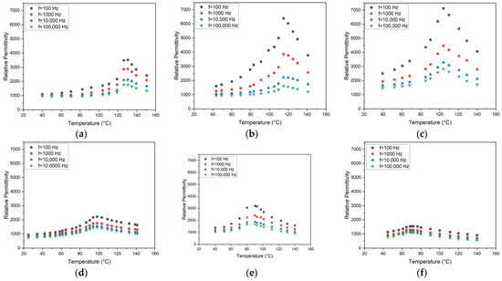 Temperature and frequency-dependent relative permittivity for all SSR-derived compositions: (a) x = 0; (b) x = 0.05; (c) x = 0.1.; (d) x = 0.15; (e) x = 0.2; (f) x = 0.25.