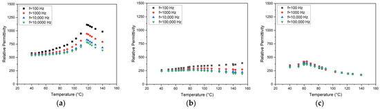 Temperature and frequency-dependent relative permittivity for all SGP-derived compositions: (a) x = 0.05; (b) x = 0.15; (c) x = 0.25.