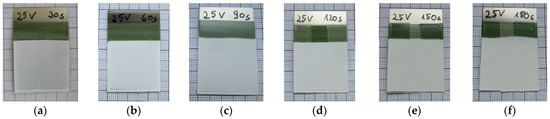 Figure 10 shows the six SSR-based deposited films on steel substrates with increasing deposition time as listed in Table 5 (SSR-Steel 1–SSR-Steel 6, Figure 10a–f) after drying under ambient conditions. It must be noted, and as described above, that the films represent a co-deposition of BST and PMMA binder. At smaller deposition times as in Figure 10a–d, the dark background of the electrode can be adumbrated. In all cases, smooth surfaces without any visible defects could be obtained. In addition, a deposition on graphite electrodes was performed (SSR-Graphite 1–6, Figure 11). Graphite was selected because after deposition, careful combustion of the graphite enables the formation of free standing thin ceramic films [47]. As in the EPD on the steel substrate, for short deposition times below 120 s, the dark graphite substrate with a non-homogeneous surface coverage can be seen. In the case of very long deposition times over 150 s, a delamination at the substrate corners can be detected. Hence, a suitable deposition time should be around 120 s.