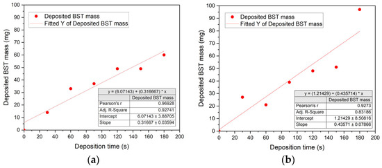 The validity of the empirical Hamaker equation can be seen in Figure 12. In Figure 12a, an increasing deposition time yields an almost linear increase in the deposited BST mass on the steel substrate. The Pearson coefficient possesses an acceptable value of 0.97 showing a reliable linear correlation between deposition time and deposited mass according to Equation (5). In Figure 12b, the corresponding behavior using the graphite substrate is depicted. As expected, an increasing deposition time delivers an increasing deposited mass, but with a pronounced scattering around the linear fit. With a value of 0.93, the Pearson coefficient is slightly reduced, but still acceptable. The deviation of the deposited mass with increasing deposition time from the linear fit can be explained by the reuse of the dispersion for all EPD experiments showing a proceeding concentration depletion.