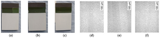 Deposited SGP samples of Ba0.75Sr0.25TiO3 with different deposition times: (a) 180 s; (b) 240 s; (c) 300 s; (d–f) microscopic images of the surfaces of depositions (a–c).