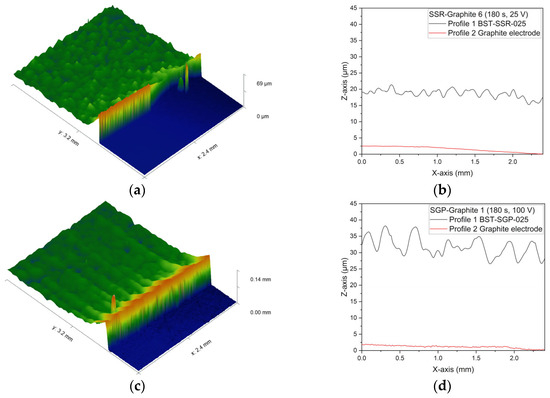 Surface characterization of deposited BST via WLI: (a) surface topography of SSR-Graphite 6 (25 V, 180 s); (b) surface profiles of SSR-Graphite 6; (c) surface topography of SGP Graphite 1 (100 V, 180 s); (d) surface profiles of SGP Graphite 1.