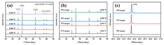 Figure 2a shows the XRD patterns of the 955 NLO targets sintered at different temperatures. It can be seen that all the peaks of the NLO targets coincide with the standard peaks (PDF# 47-1049) for the face-centered cubic phase structure. There are no obvious impurity phases in the NLO targets, indicating that the Li ions have dissolved into the lattice of the NiO. The intensity of the peaks gradually increases with the increasing sintering temperature, indicating that the NLO targets have good crystallinity. As shown in Figure 2b, the impurity phases of 991 and 973 NLO targets sintered at temperatures ranging from 1250 °C to 1450 °C are invisible, which is in agreement with the results of the 955 NLO targets. Therefore, the NLO targets doped with three contents show a single-phase structure. Figure 2c indicates that the (200) peaks of the 991, 973, and 955 NLO targets sintered at 1250 °C shift toward the high angle with the increase in doping content. The reason for that occurrence is that the ionic radius of Li+ (0.59 Å) is smaller than that of Ni2+ (0.76 Å) [].