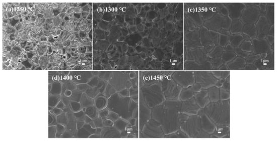 Figure 3 shows the surface morphologies of the 991 NLO targets sintered at different temperatures. It can be seen that the grain size of the 991 NLO targets gradually increases with the increase in sintering temperature, and the grain boundaries are clear and visible. Moreover, small pores are observed on the surface when the targets are sintered at a low temperature, typically localized at grain boundaries. As the sintering temperature increases, the pores become invisible. Therefore, higher temperatures can promote sintering densification and eliminate pores.