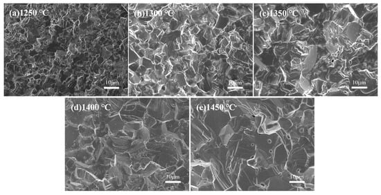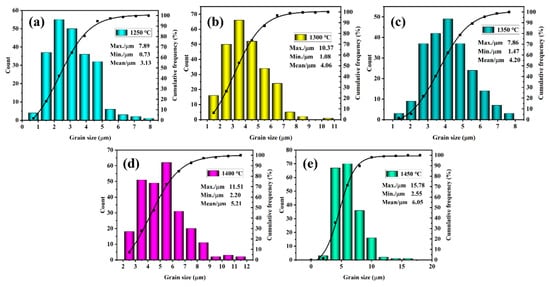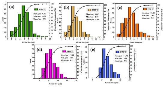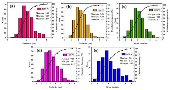 The grain size distribution of the 991 targets sintered at different temperatures is shown in Figure 5. It can be seen that the average grain size of the 991 targets gradually increases from 2.01 μm to 5.02 μm with the increase in sintering temperature, and the grains are fine and uniformly distributed.