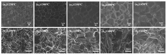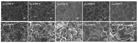 Figure 6 and Figure 7 are the surface and cross-sectional morphologies of the 973 and 955 NLO targets. It can be seen that the heavily doped NLO targets exhibit distinct grain boundaries and a denser microstructure. The Li2O additives are good sintering aids that can enhance sintering densification. The more the doping contents, the better the sintering densification. The grain size distributions in Figure 8 and Figure 9 show that the average grain size of the 973 targets increases from 3.13 μm at 1250 °C to 6.05 μm at 1450 °C, and that the average grain size of the 955 targets increases from 3.91 μm to 7.71 μm. Therefore, the Li2O additives also promote grain growth.