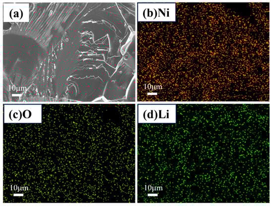 (a) The cross-sectional morphology and (b) Ni, (c) O, and (d) Li element distribution in the 955 NiO target sintered at 1450 °C.