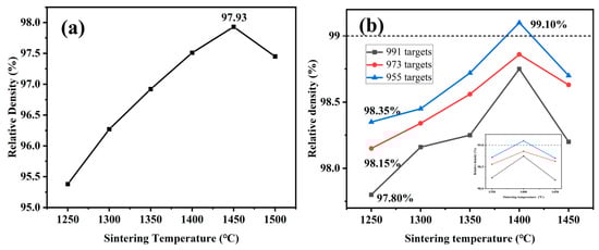 The relative density of the NiO and NLO targets sintered at different temperatures is shown in Figure 11. Figure 11a shows that the density of pure NiO target increases with increasing sintering temperature, and then decreases because of overheating. The optimal density obtained at 1450 °C is only 97.93%, which should be further improved. As shown in Figure 11b, the densities of the 991, 973, and 955 NLO targets increase markedly initially, followed by a slight decrease as the sintering temperature is further elevated. The density of 97.80% for the 991 NLO target sintered at 1250 °C is close to the optimal density of the pure NiO target obtained at 1450 °C. Therefore, Li2O can effectively decrease sintering temperature and promote sintering densification, which means it is suitable as a sintering aid for NiO-based ceramics. Compared with the density of the 991 NLO targets, the 973 and 955 NLO targets show higher density at the same sintering temperature because the high Li2O doping content is more conducive to sintering densification. The optimal densities of the 991, 973, and 955 NLO targets sintered at 1400 °C are 98.75%, 98.86%, and 99.10%, respectively. However, all the targets sintered at 1450 °C show a decreased density because Li2O sintered at 1450 °C is easy to decompose and vitalize []. Therefore, the Li2O additives decrease sintering temperature and achieve high density, which contributes to the inhibiting of nodule formation during magnetron sputtering.