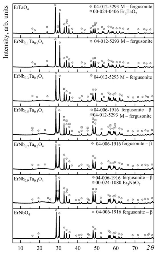 Palatnikov M, Shcherbina O, Fokina N, Smirnov M, Zelenina E, Masloboeva S, Manukovskaya D. Erbium Orthoniobate-Tantalates: Structural, Luminescent and Mechanical Properties of ErNbxTa1−xO4 Ceramics and Bactericidal Properties of ErNbO4 Powder. Ceramics. 2025; 8(4):130. https://doi.org/10.3390/ceramics8040130
