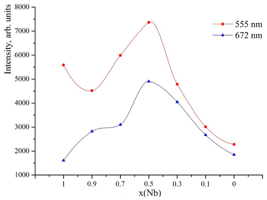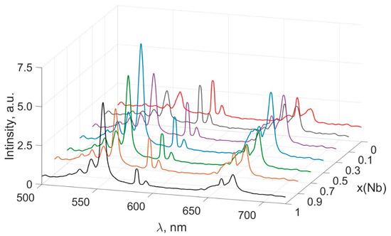 3.4. Study of PL of Ceramic Solid Solutions ErNbxTa1−xO4 (x = 0; 0.1; 0.3; 0.5; 0.7; 0.9; 1)