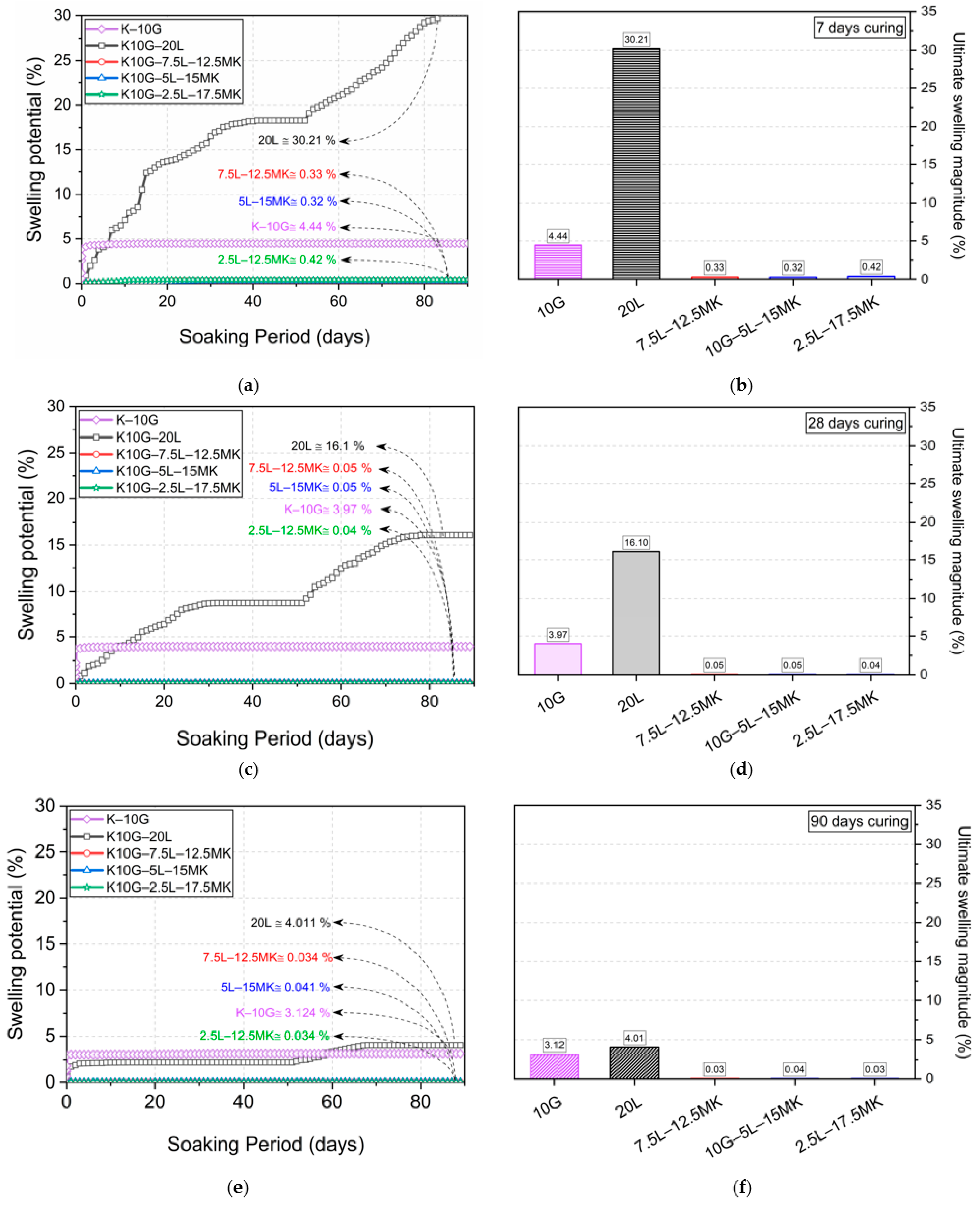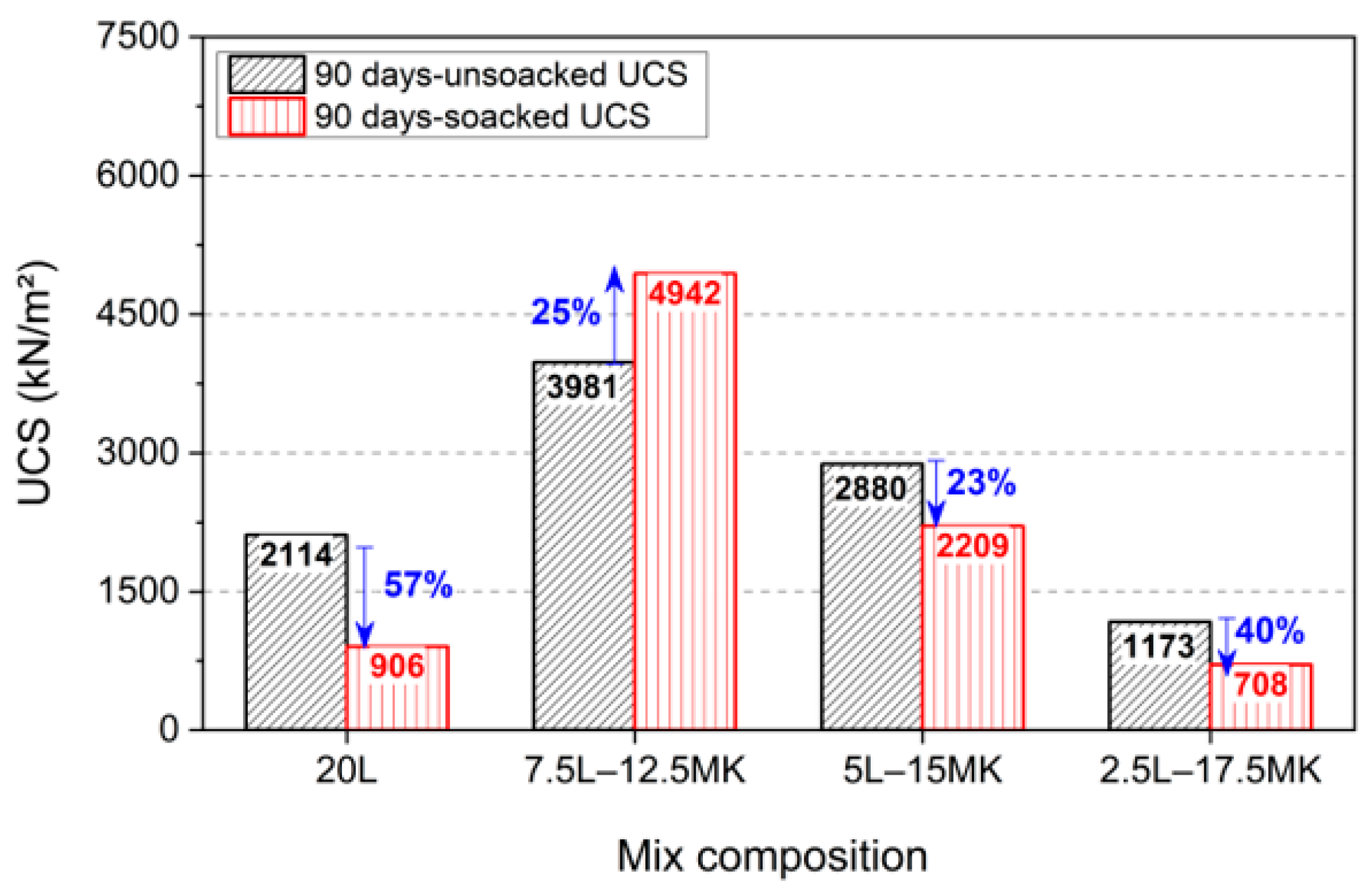 - The physico-mechanical assessment identified 7.5L–12.5MK as the optimal blend for sulfate soil stabilisation, specifically increasing the strength to about fourfold and suppressing the swelling to near-zero (0.33%).