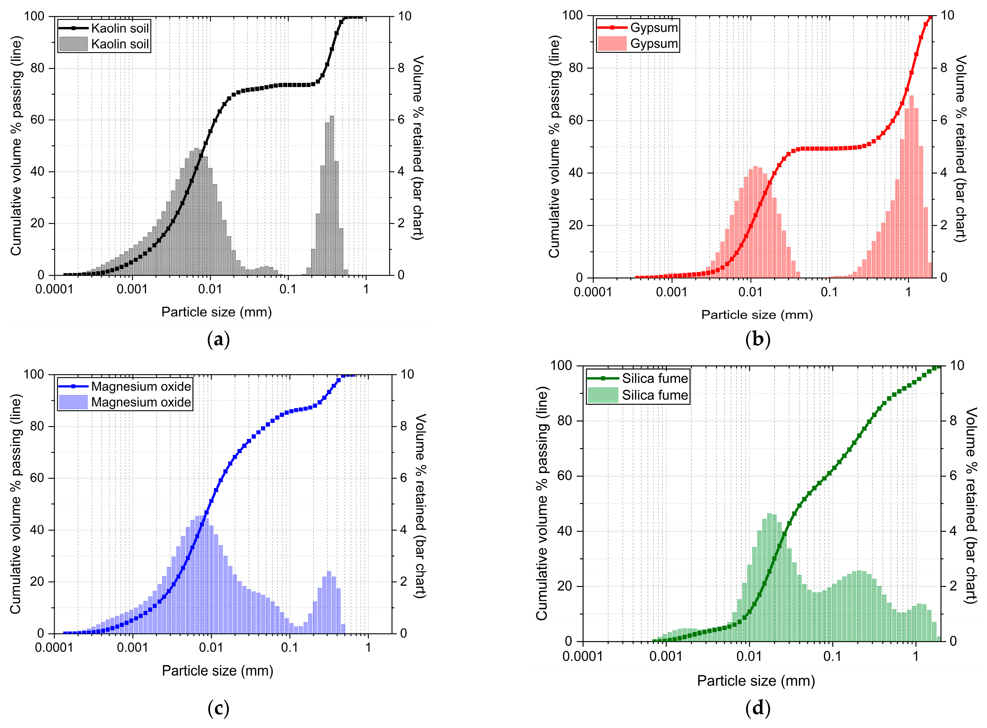 - Zaini, M.S.I.; Hasan, M.; Almuaythir, S.; Hyodo, M. Experimental Investigations on Physico-Mechanical Properties of Kaolinite Clay Soil Stabilized at Optimum Silica Fume Content Using Clamshell Ash and Lime. Sci. Rep. 2024, 14, 10995. [Google Scholar] [CrossRef] [PubMed]