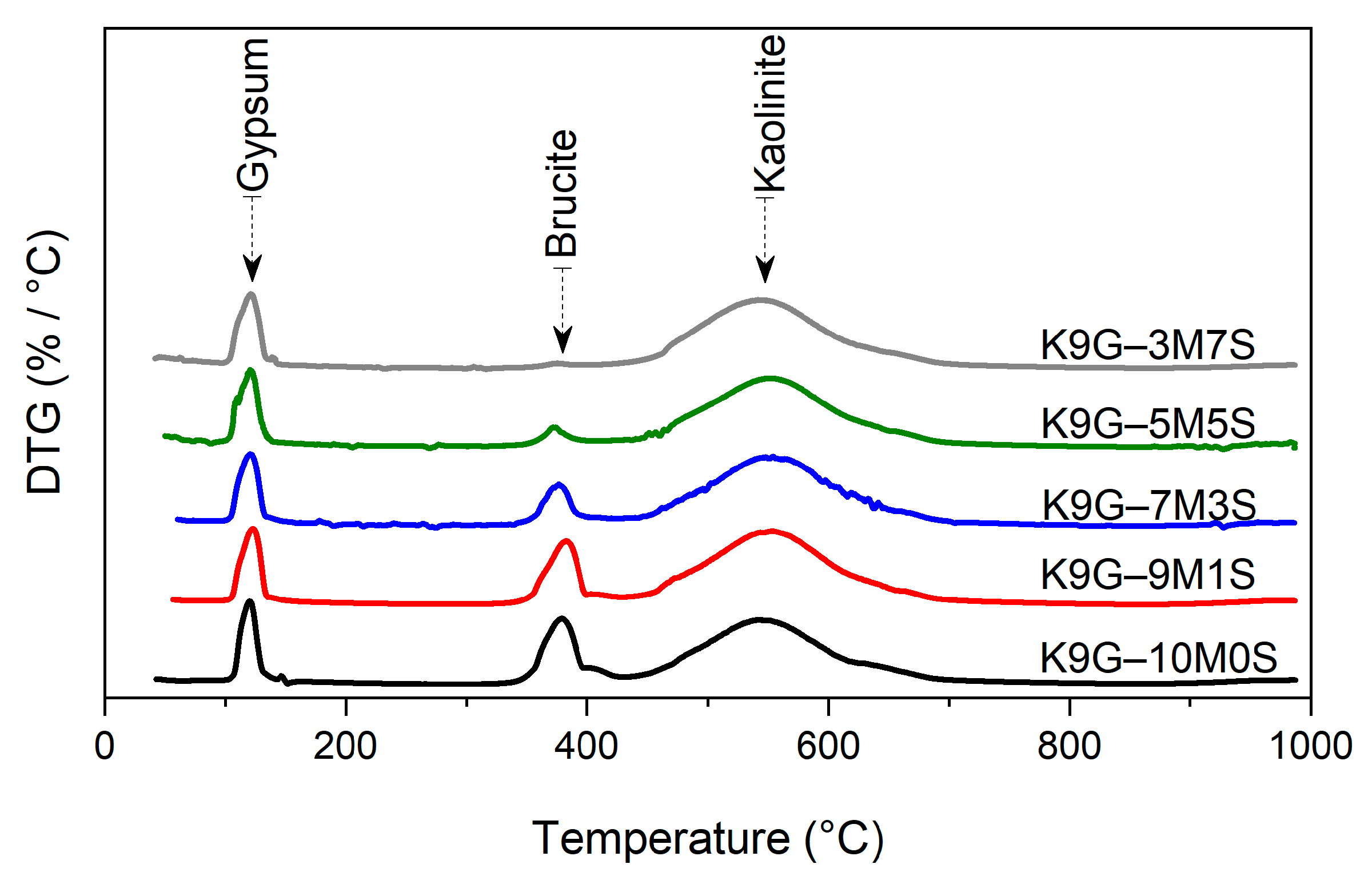 - Jin, F.; Al-Tabbaa, A. Thermogravimetric Study on the Hydration of Reactive Magnesia and Silica Mixture at Room Temperature. Thermochim. Acta 2013, 566, 162–168. [Google Scholar] [CrossRef]