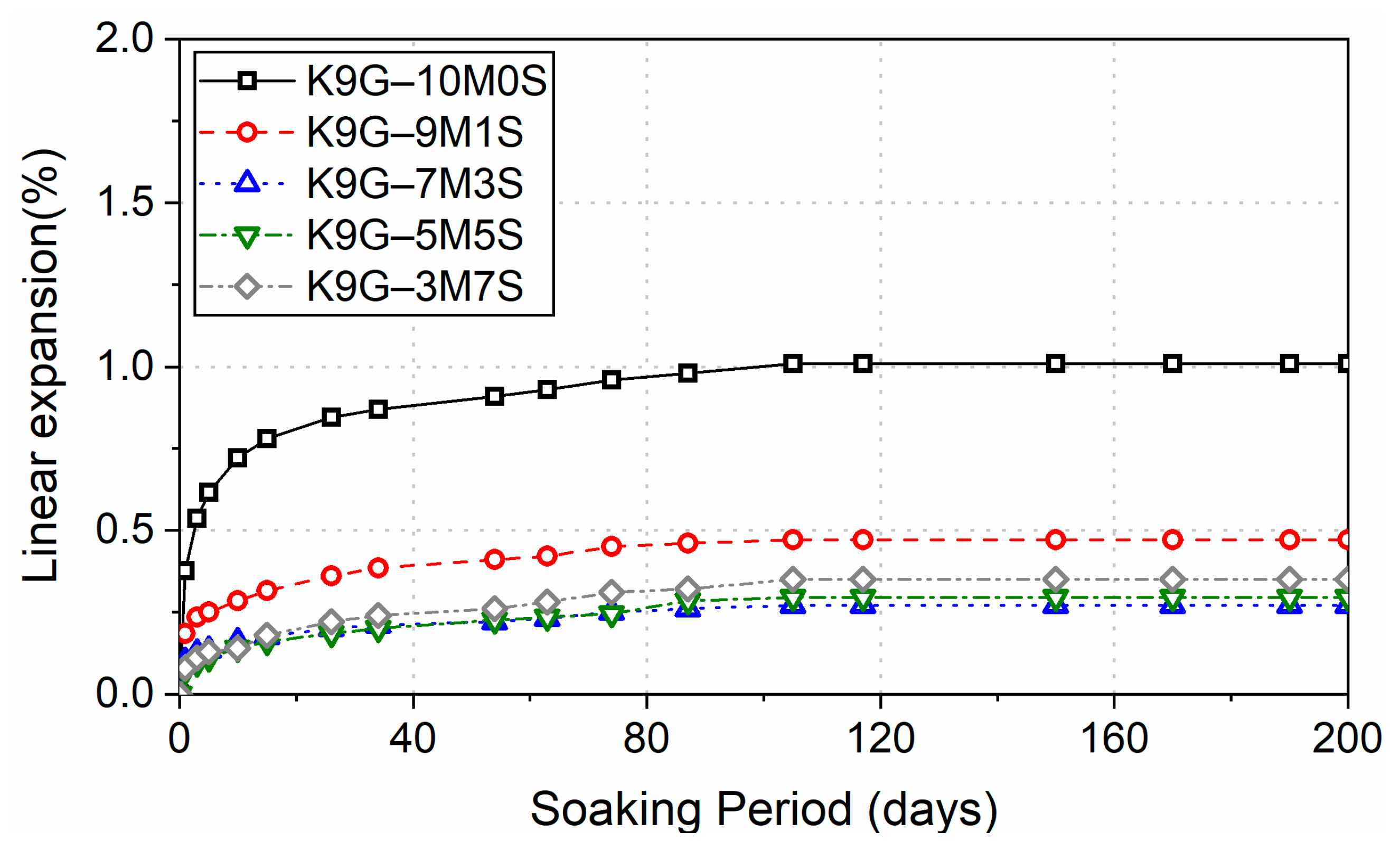 - Li, W.; Yi, Y.; Puppala, A.J. Suppressing Ettringite-Induced Swelling of Gypseous Soil by Using Magnesia-Activated Ground Granulated Blast-Furnace Slag. J. Geotech. Geoenviron. Eng. 2020, 146, 06020008. [Google Scholar] [CrossRef]