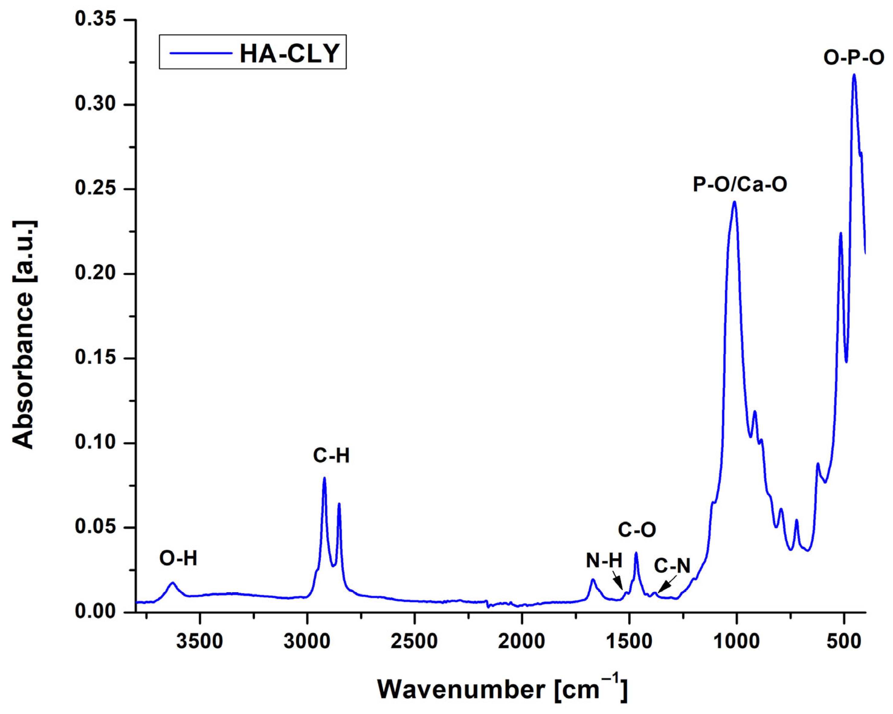 The ATR FT-IR analysis was first performed on the HA-CLY powder to confirm the successful loading of the hydroxyapatite particles with the antibacterial agent; the resulting spectrum is illustrated in