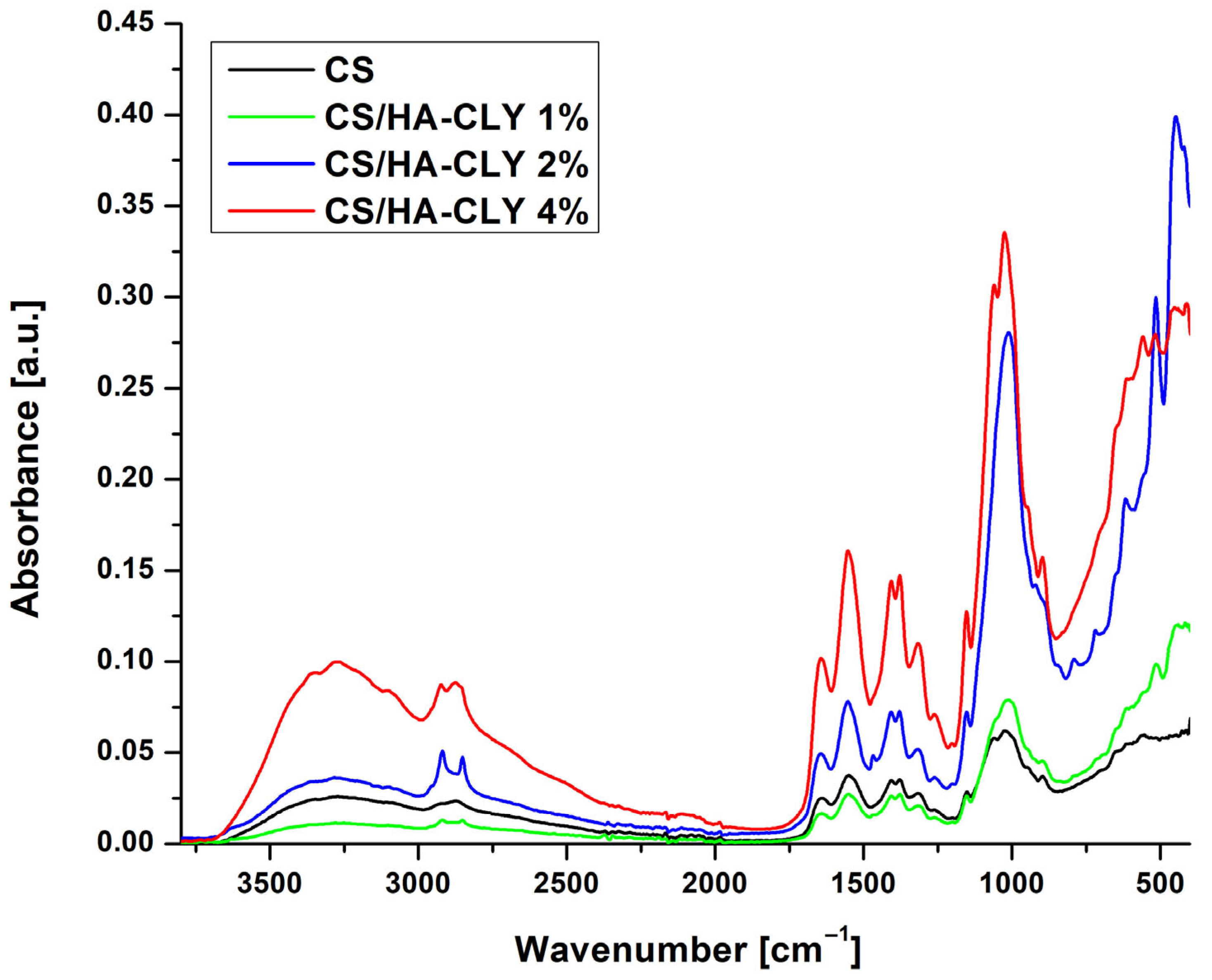 35]. In the case of the CS membrane containing 4% HA-CLY, these signals were significantly more intense, indicating a higher degree of inorganic phase loading; therefore, these membranes were selected for further analysis to obtain more visible results.