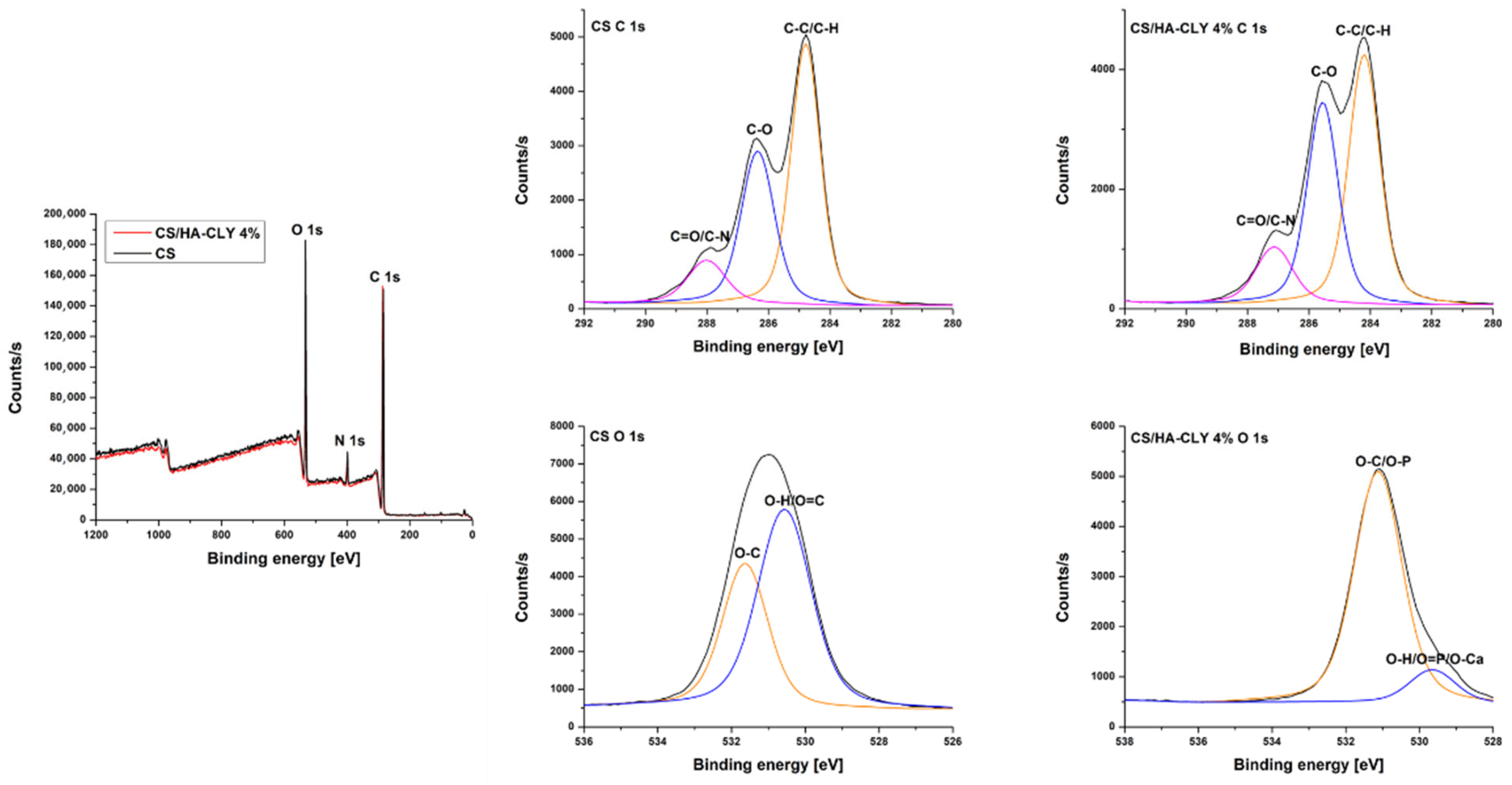 The C 1s spectrum of the composite CS/HA-CLY membrane retained the same three main components, but with a redistribution of intensities. In addition to the peak at 284.78 eV (C–C/C–H), a more pronounced peak at 285.99 eV was noticed and attributed to clindamycin-specific C–N bonds, which indicated the interaction between the antibiotic and the polymer matrix [