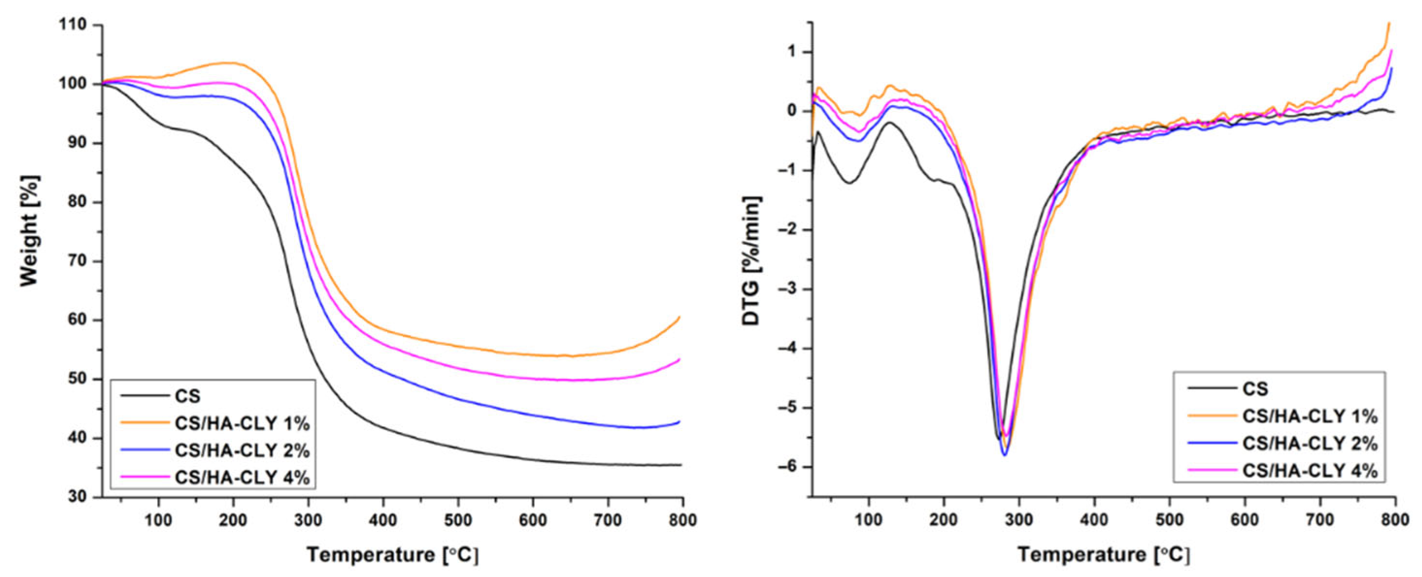 max from 272 °C to 284 °C after incorporating HA-CLY demonstrates a clear improvement in the thermal stability of the chitosan matrix. This enhancement can be attributed to the inorganic and thermally stable nature of hydroxyapatite, which acts as a barrier to heat and mass transfer during polymer decomposition. Additionally, strong intermolecular interactions between chitosan and HA—such as hydrogen bonding and electrostatic attraction—likely restrict the mobility of polymer chains, further improving stability. The variation in residual mass with increasing HA-CLY content supports these findings. The highest residue (61%) was observed for the CS/HA-CLY 1 wt.% composite, suggesting optimal interfacial compatibility between the organic and inorganic components at this concentration. At higher HA-CLY loadings (2 and 4 wt.%), the decrease in residue (to 57% and 46%, respectively) may result from particle agglomeration and reduced dispersion, which weaken matrix–filler interactions and lower the effectiveness of the thermally stable phase.