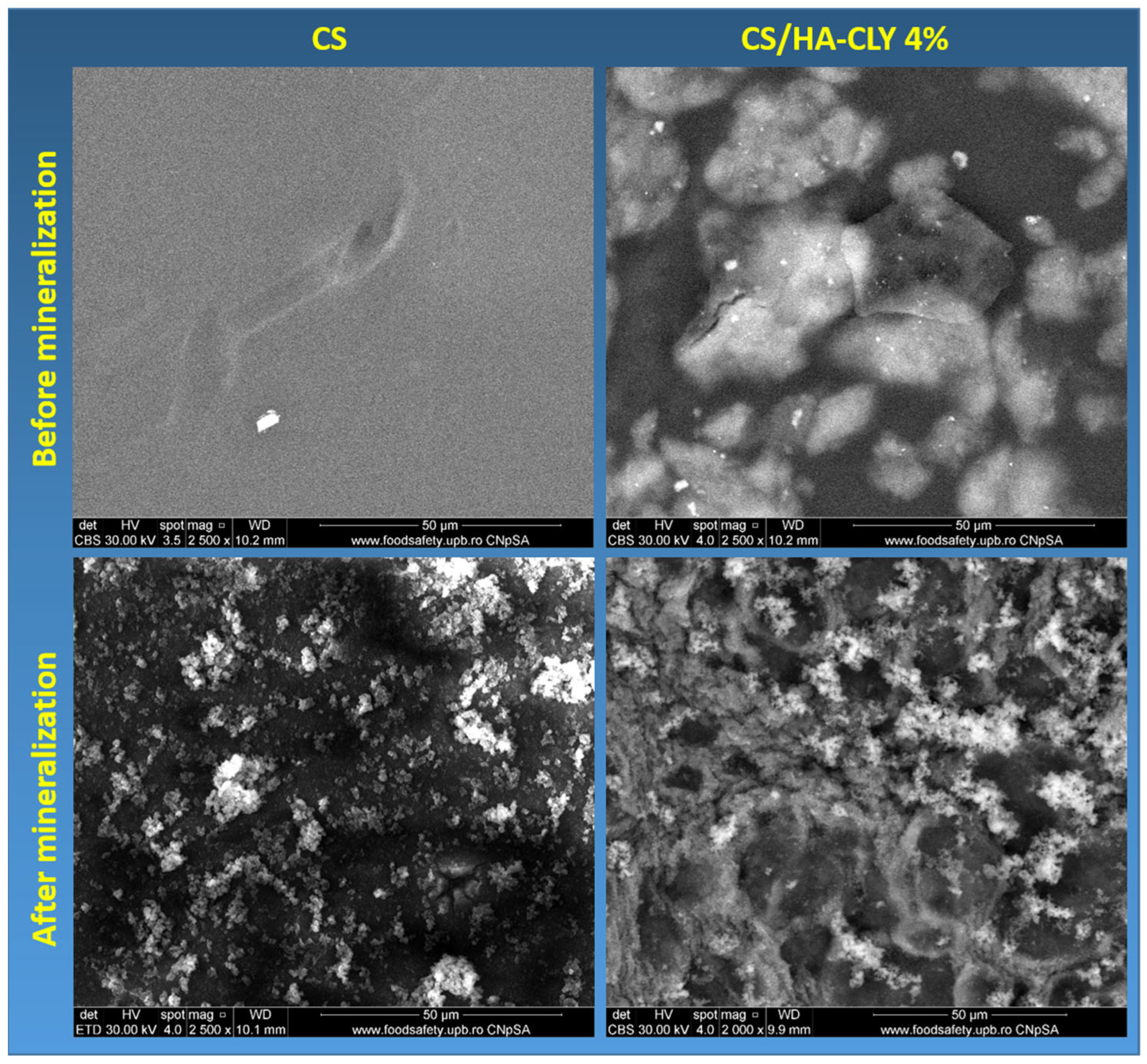 Figure 5 illustrates the morphology of the neat and 4% HA-CLY CS membranes before and after mineralization. The neat membrane had a smooth, compact surface, lacking visible porosity, with a dark homogeneous contrast, indicating the exclusive presence of the polymer phase. Scattered particles with irregular morphology were also observed and were considered residual aggregates of chitosan that resulted from incomplete polymer homogenization or impurities attached to the membrane surface during the drying process [