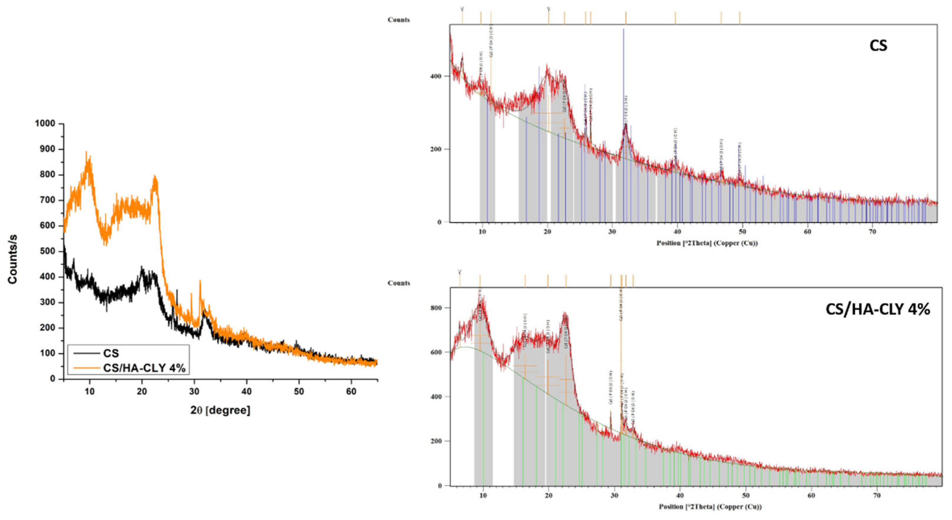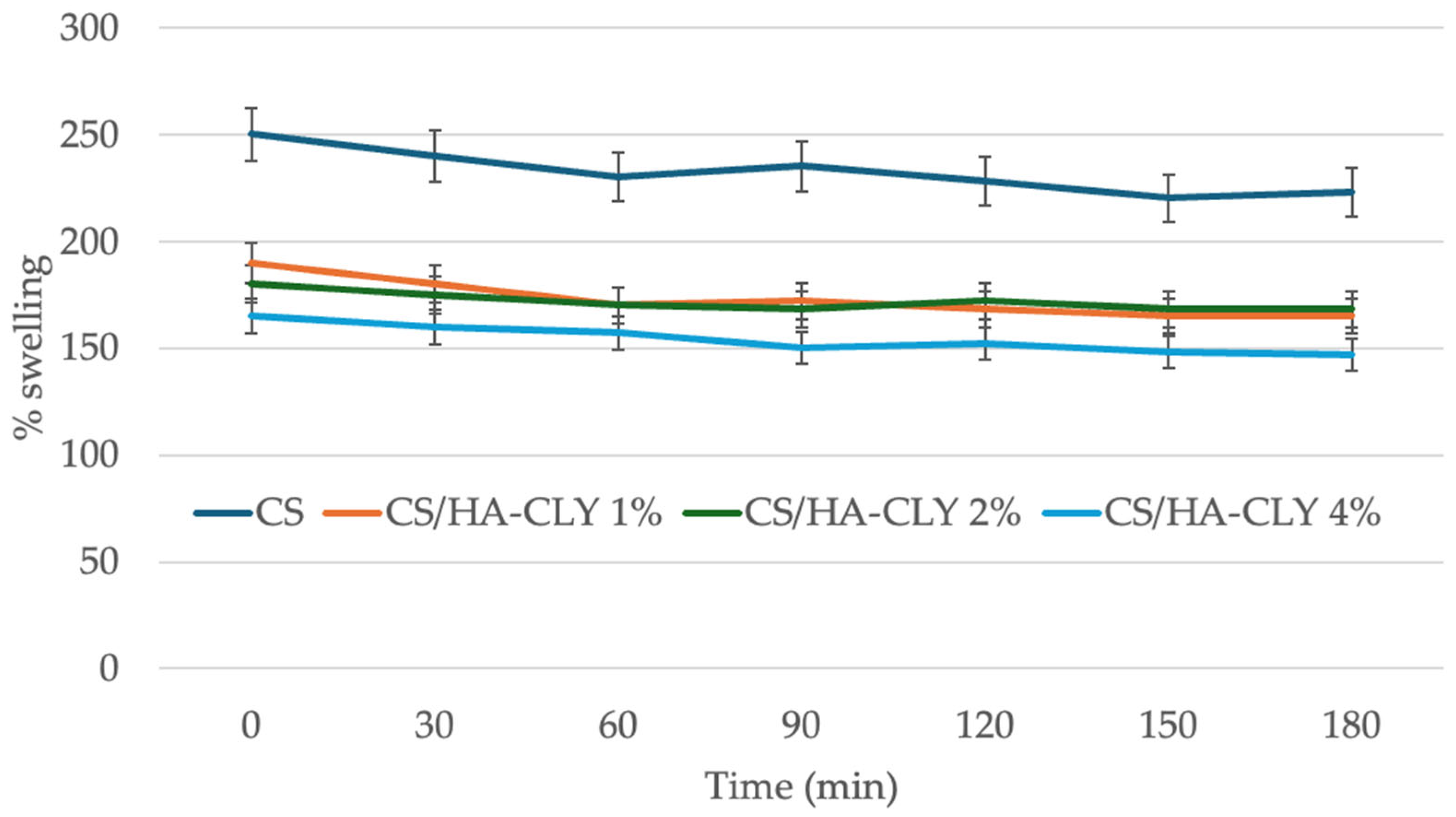 Figure 8), ranging from 223% to 260%. In the case of the composite membranes, the swelling degree decreased, as part of the membrane volume was occupied by hydroxyapatite particles. A similar swelling behavior was observed for CS/HA-CLY 1% and CS/HA-CLY 2% membranes, while a more pronounced reduction was seen for CS/HA-CLY 4%, corresponding to the higher filler content.