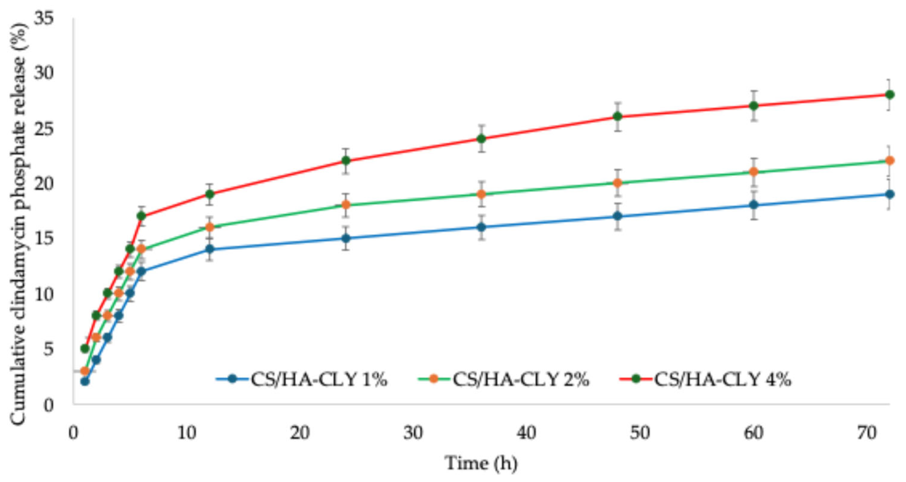 59]. Furthermore, Podar et al. modified PCL-based scaffolds with CS/alendronate-modified HA composite coatings and showed that HA governs the bioactive drug release and enhances cellular adhesion, proliferation, and differentiation into osteocytes. In this study, during the initial 6 h of release, the percentage of antibiotic varied between 12% for CS/HA-CLY 1% and 17% for CS/HA-CLY 4%, which was attributed to the higher amount of antibiotic present as the HA percentage increases. When compared to the values obtained after 72 h (17% for CS/HA-CLY 1%, 20% for CS/HA-CLY 2%, and 26% for CS/HA-CLY 4%), the membranes demonstrate a prolonged release profile, making them ideal candidates for potential treatment of infections at the site of implantation. Moreover, the results related to antibiotic release in this study indicate that the developed system is an appropriate option for sustained drug delivery at the implantation site, especially in comparison to other release profiles reported in the literature for clindamycin phosphate, such as wound-healing hydrogels that show complete release within the first 6 h [