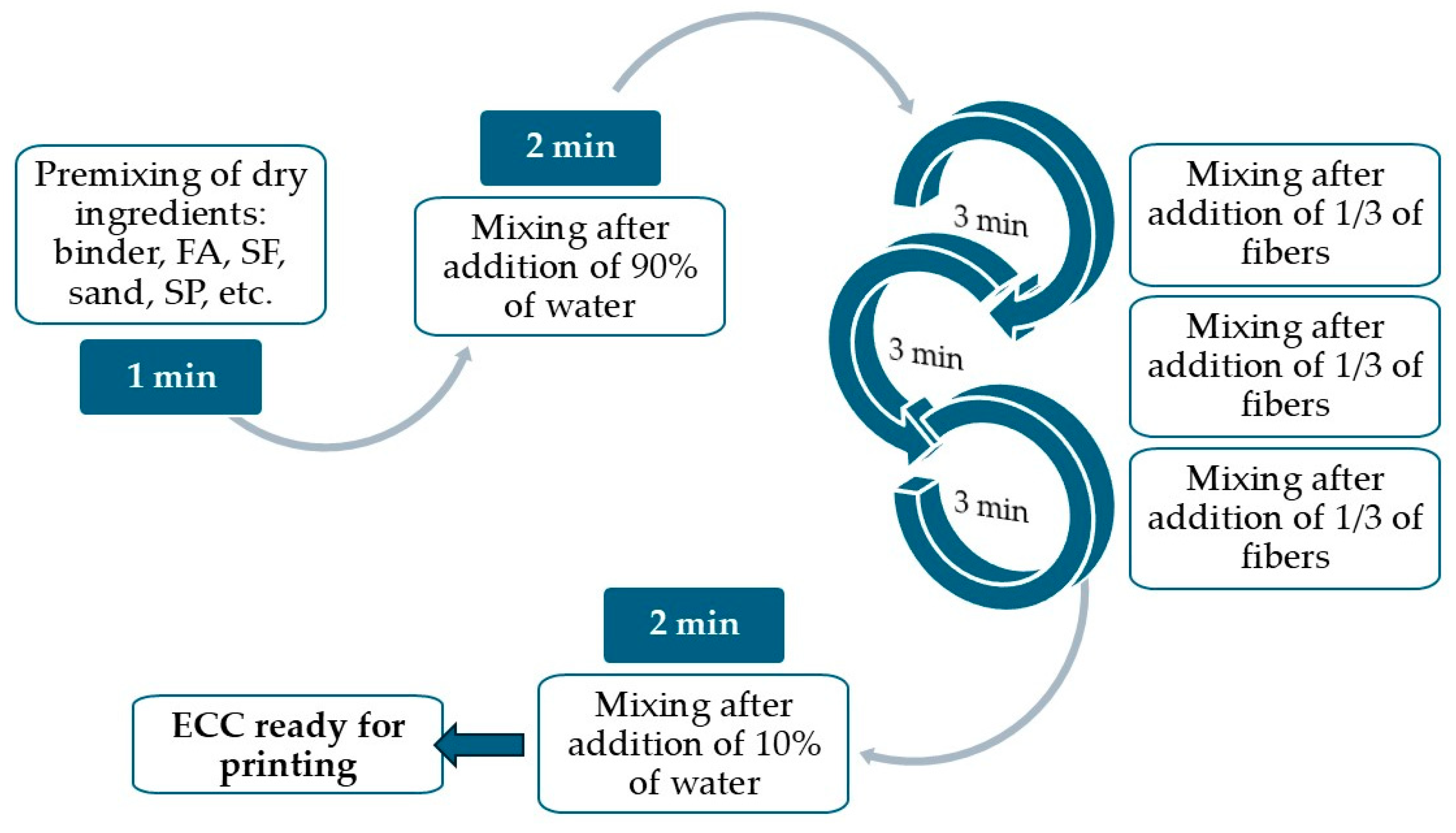 - The order of mixing the products is fundamental in 3DP-ECC: First, solids are dry-mixed, then water and SP are added, and fibers are progressively introduced in the mix. Finally, the VMA is supplemented;