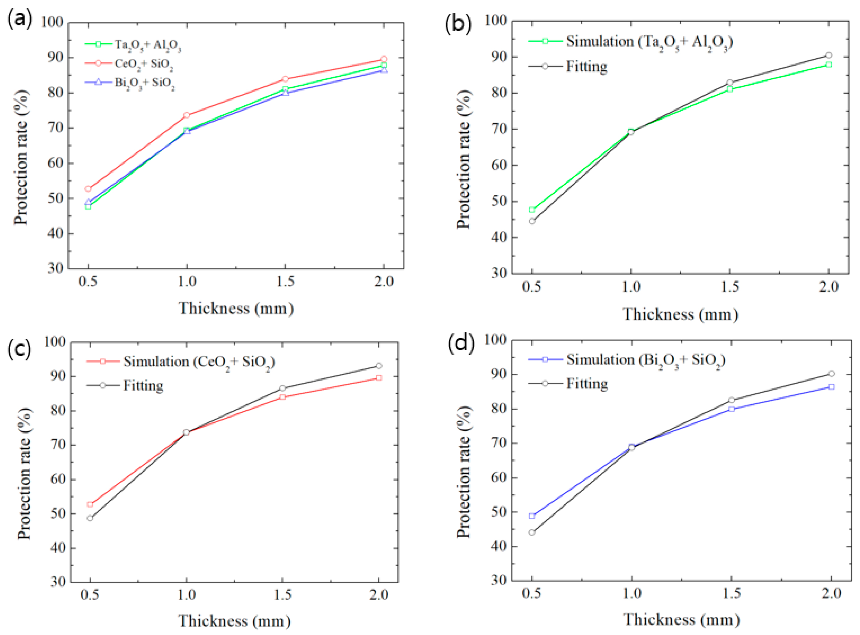 - In experimental evaluations, similar shielding performance was also observed, although Bi2O3 exhibited comparatively lower performance, whereas Ta2O5 yielded the most superior results.