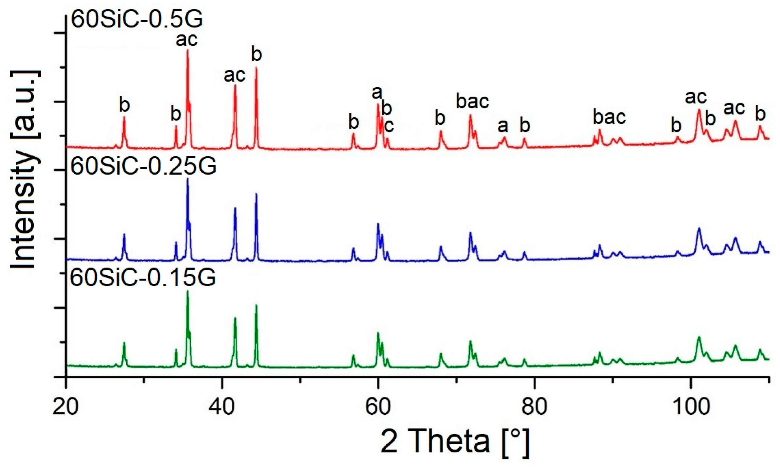 The absence of peaks characteristic of SiO, SiO2, and B2O3 on the X-ray diffraction patterns in sintered samples may be due to the low concentration of these oxides in the samples, as well as the formation of an amorphous structure. On the other hand, it can be assumed that the temperature of 1870 °C is not sufficient to ensure rapid high-temperature chemical reactions in the 60SiC-G system.