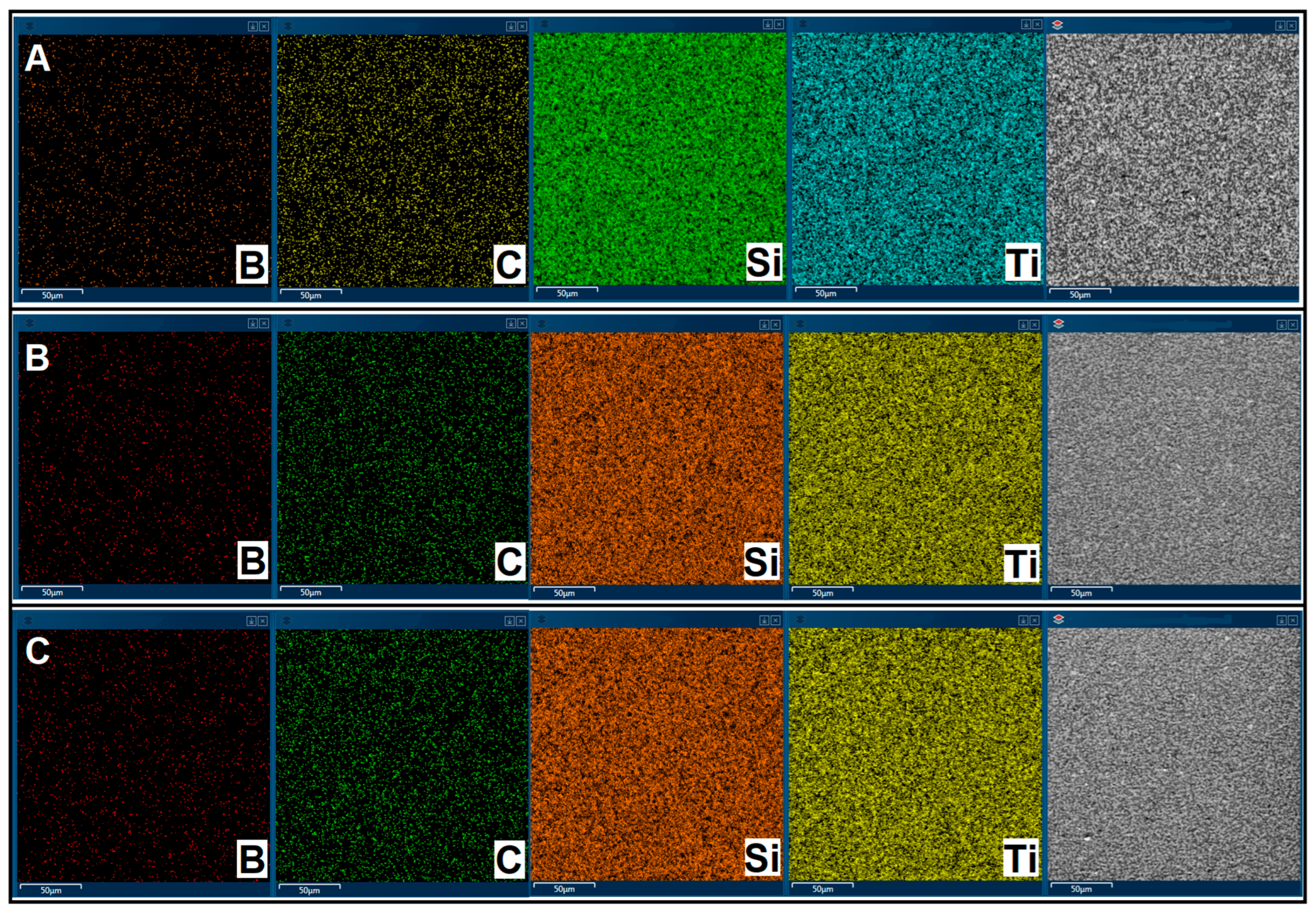 Regardless of the rGO content in the matrix, all phases are evenly distributed over the volume. The grain size of the phases for 60SiC sample is within 2.6 microns for SiC, 1.5 microns for TiB2, and 1.4 microns for TiC. The grain size of the phases for ceramic-rGO samples is in the range of 2.4–1.9 microns for SiC, 1.1–0.7 microns for TiB2, and 1.1–0.9 microns for TiC. Therefore, the presence of rGO in the compositions slows down the process of grain growth of the ceramic phases during sintering. The chemical composition of the sintered samples is shown in Figure 3 in the form of element distribution maps. The figure shows that the following elements were found in the sintered samples: boron, carbon, silicon and titanium. It can also be observed that these elements are evenly distributed over the entire volume of the samples.