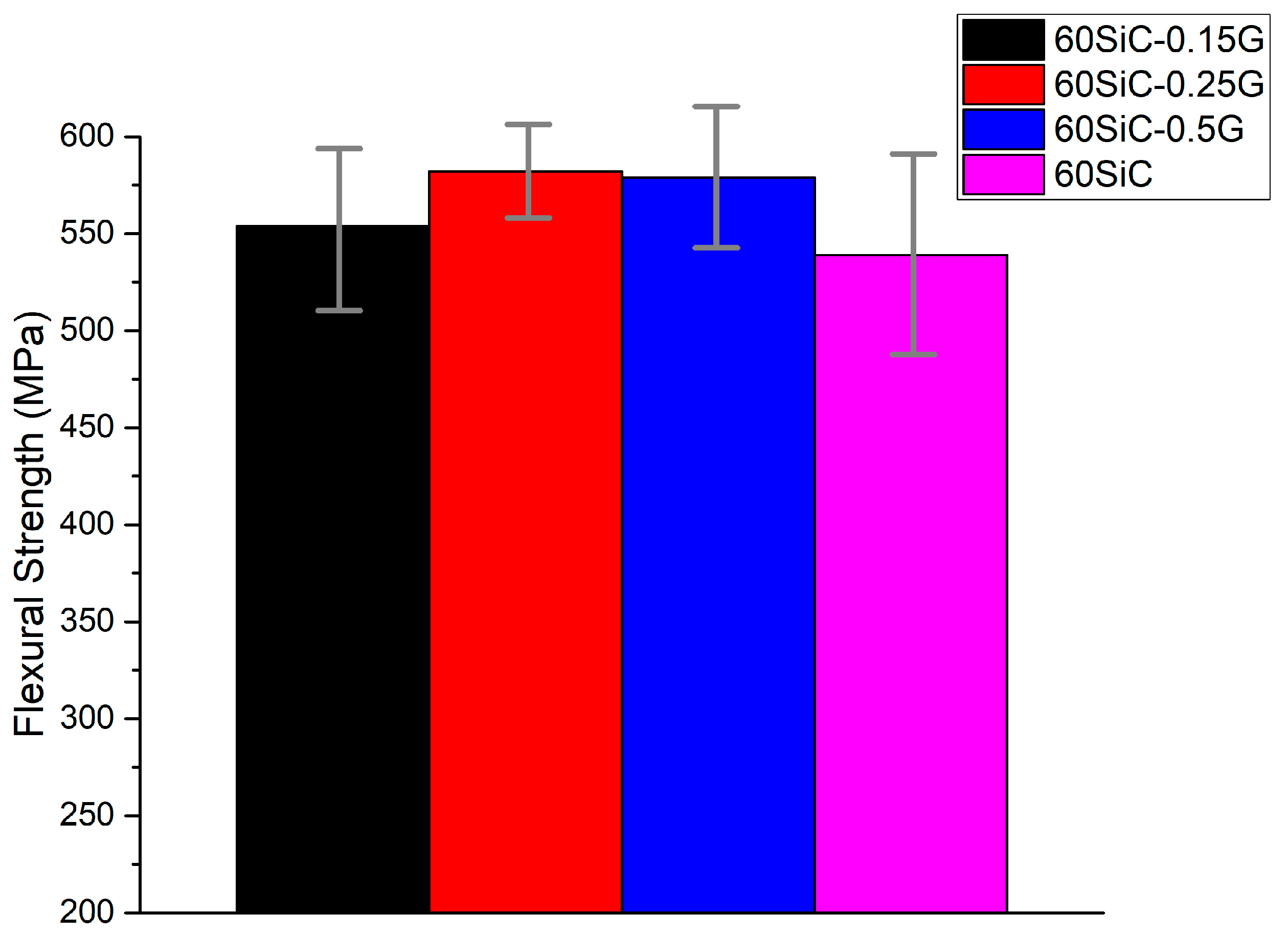 It is worth noting that the bending strength has a similar behavior to the relative density of samples, where samples with a high rGO content (0.25 and 0.5 vol.%) show the best results (582.8 ± 27.6 MPa and 578.4 ± 37.5 MPa, respectively). The maximum bending strength of the 60SiC sample is 0.25G, which is 7.9% higher than that of the non-graphene sample. A similar behavior of bending strength is observed in [22]. The strength increases with the addition of rGO, reaching a maximum value of 582.8 ± 27.6 MPa for the composite with 0.25 vol % rGO, which represents an improvement of 26% compared to the pure SiC. A further increase in the rGO content up to 0.5 vol % leads to a gradual decrease in the strength.