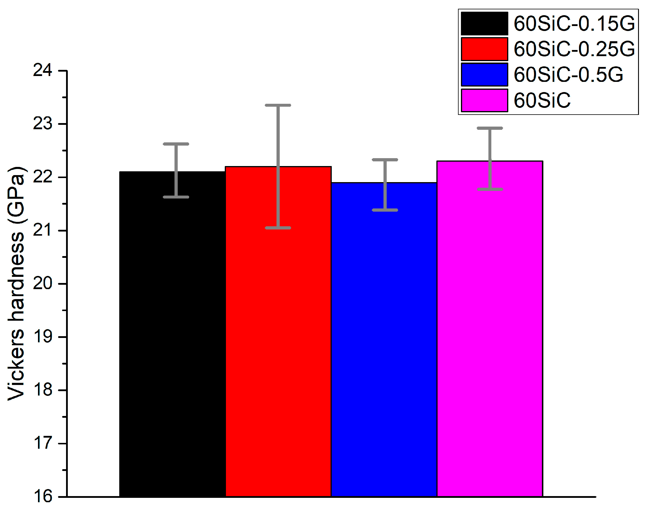 The presence of reduced graphene oxide in 60SiC samples has no positive effect on hardness. This is because graphene is a relatively soft phase (hardness ~0.5–5 GPa for individual layers in the transverse direction) compared to the extremely hard ceramic SiC matrix (~25–30 GPa). The indenter easily pushes through rGO inclusions, so the overall macroscopic hardness of the composite is determined primarily by the hardness of the matrix and almost does not increase from the addition of a softer phase [32].