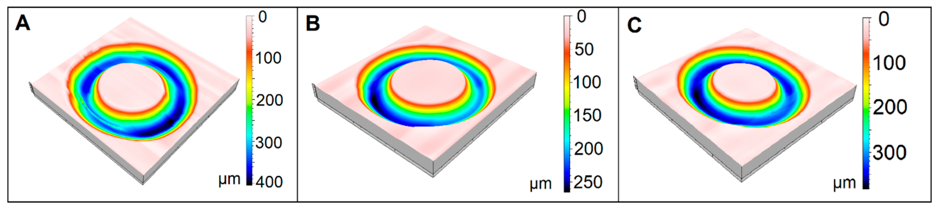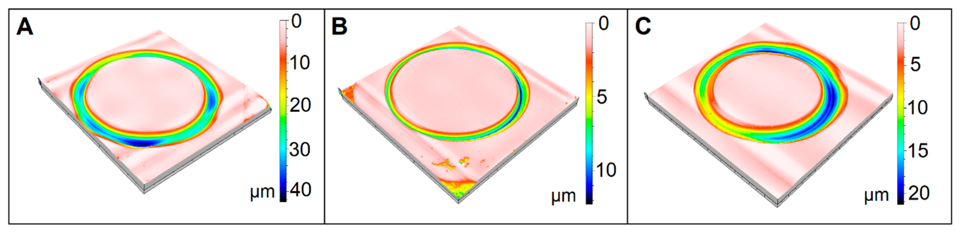 Figure 10. Three-dimensional friction tracks at a load of 30 N: (A) 60SiC-0.15G, (B) 60SiC-0.25G, (C) 60SiC-0.5G.