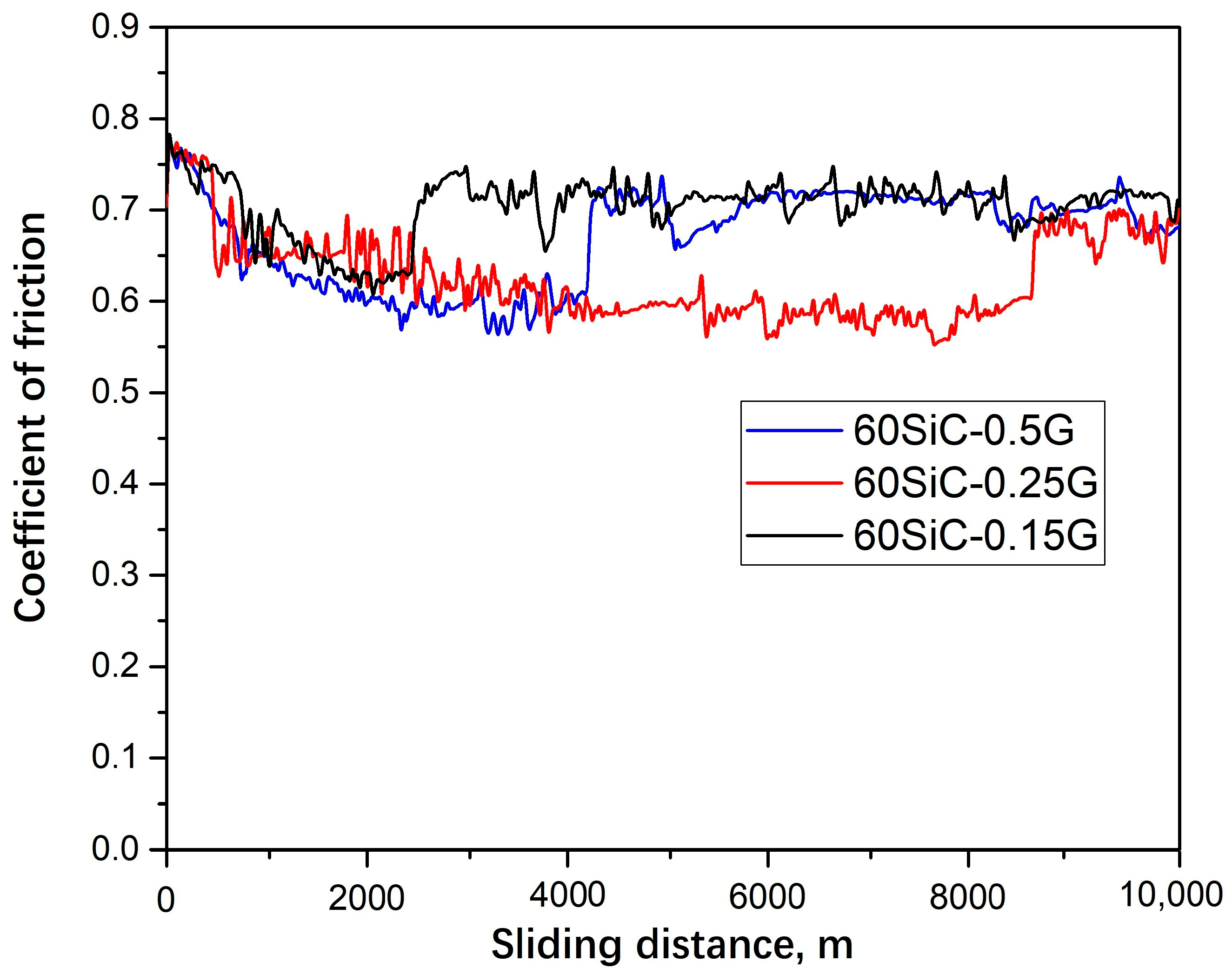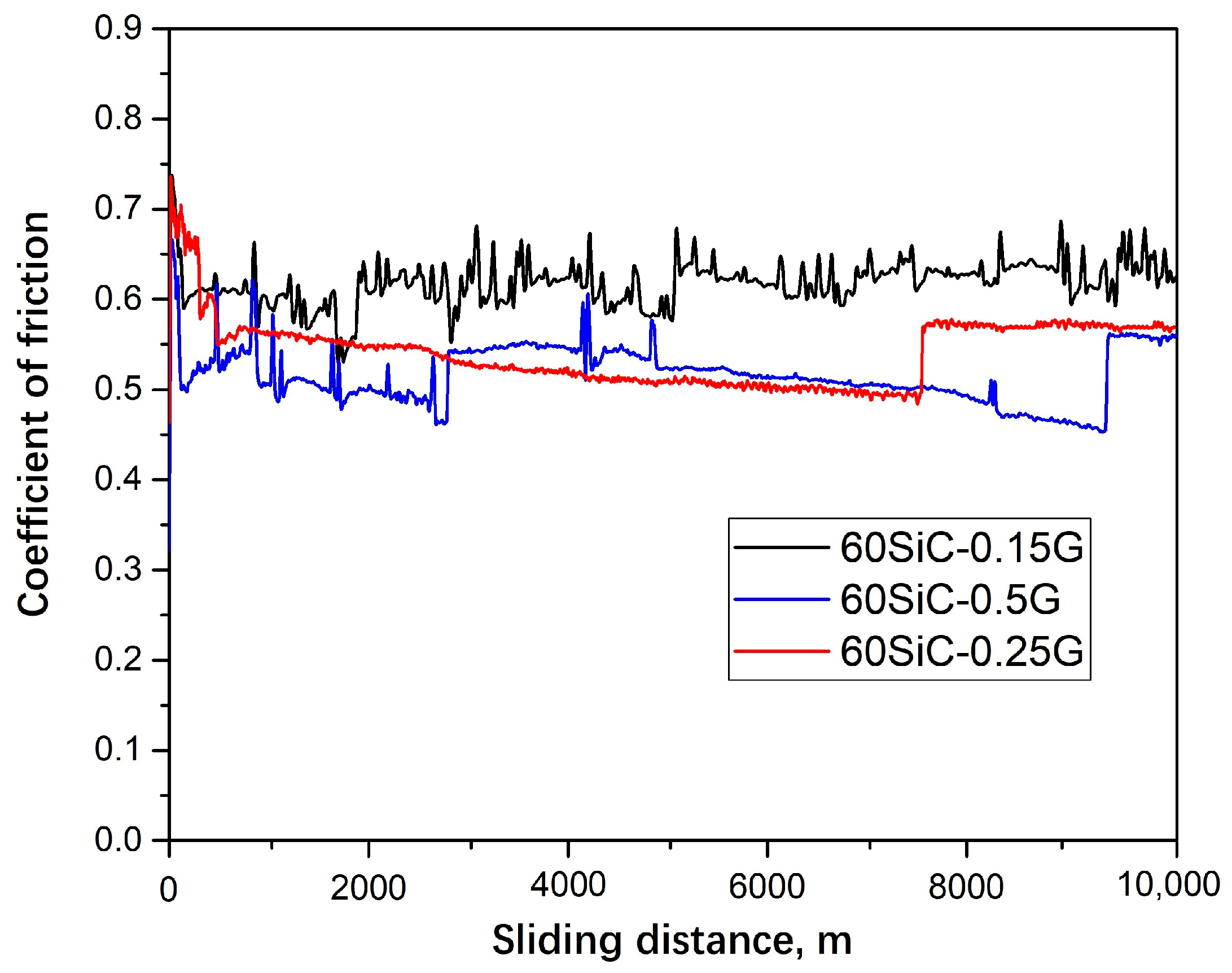 Figure 12. The dependence of the coefficient of friction of 60SiC-G compositions on the sliding distance at a load of 10 N.
