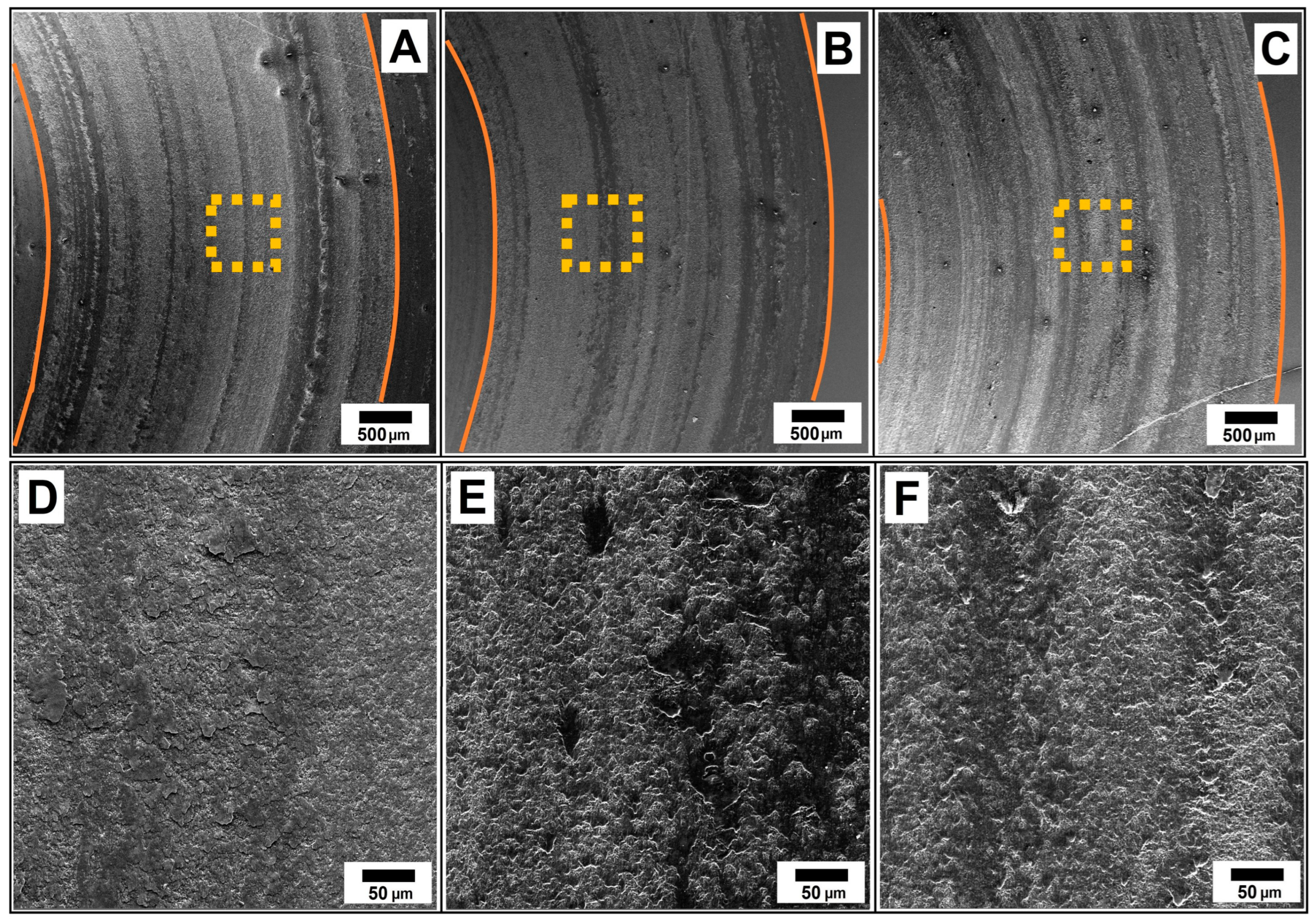 Figure 15A–C shows the friction tracks (orange lines) of the 60SiC-G samples at 30 N load. Figure 15D–F shows an enlarged central area (orange squares) of the friction track.