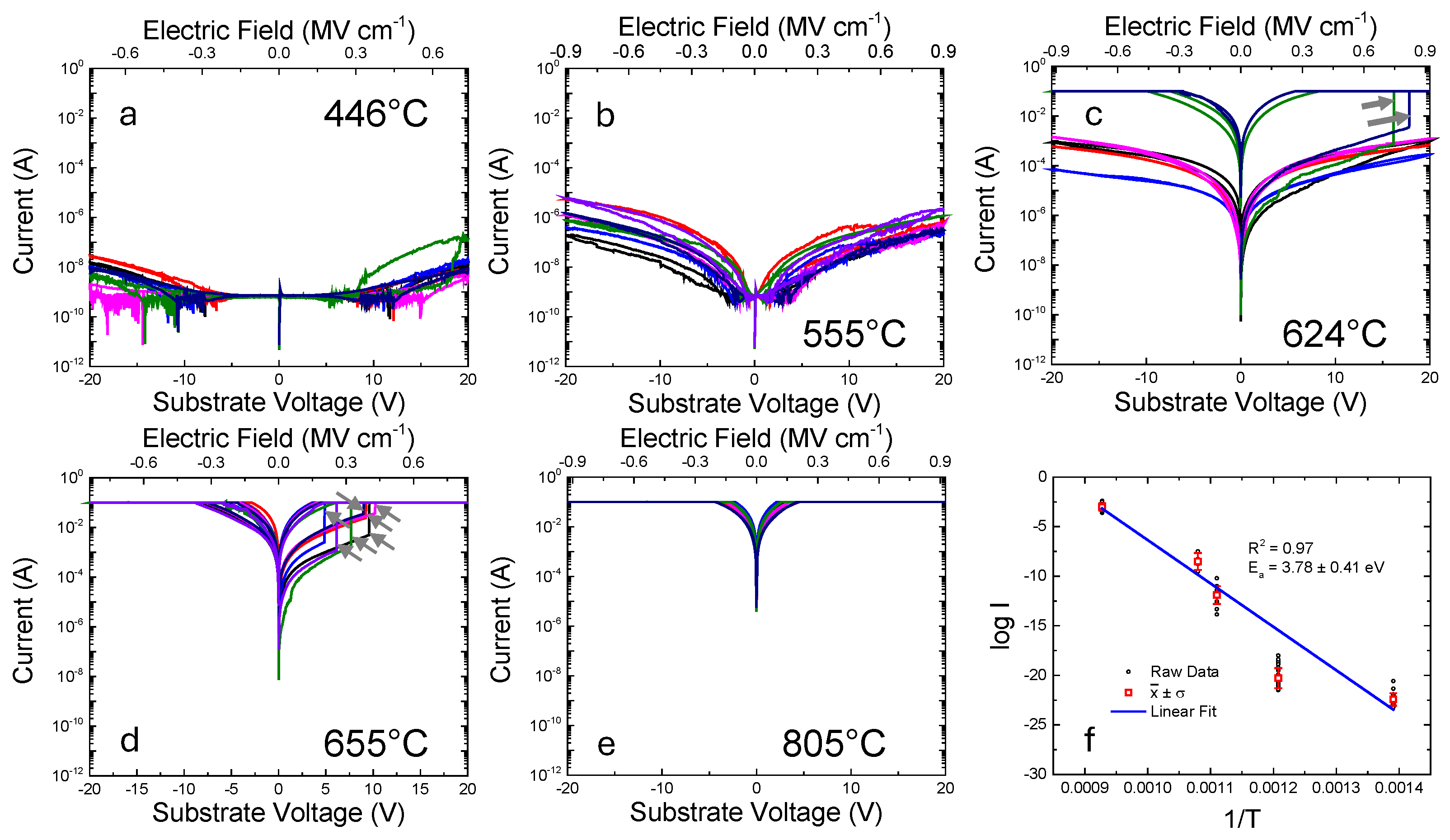 Figure 1f, the current at 2 V (or an equivalent current for the film grown at 446 °C, where the current at 2 V is too low, so the current at 10 V divided by 5 is used instead) is plotted on a logarithmic scale against the inverse of the growth temperature. Fitting the data using an Arrhenius law yields an apparent activation energy of 3.78 eV, with a correlation coefficient of R