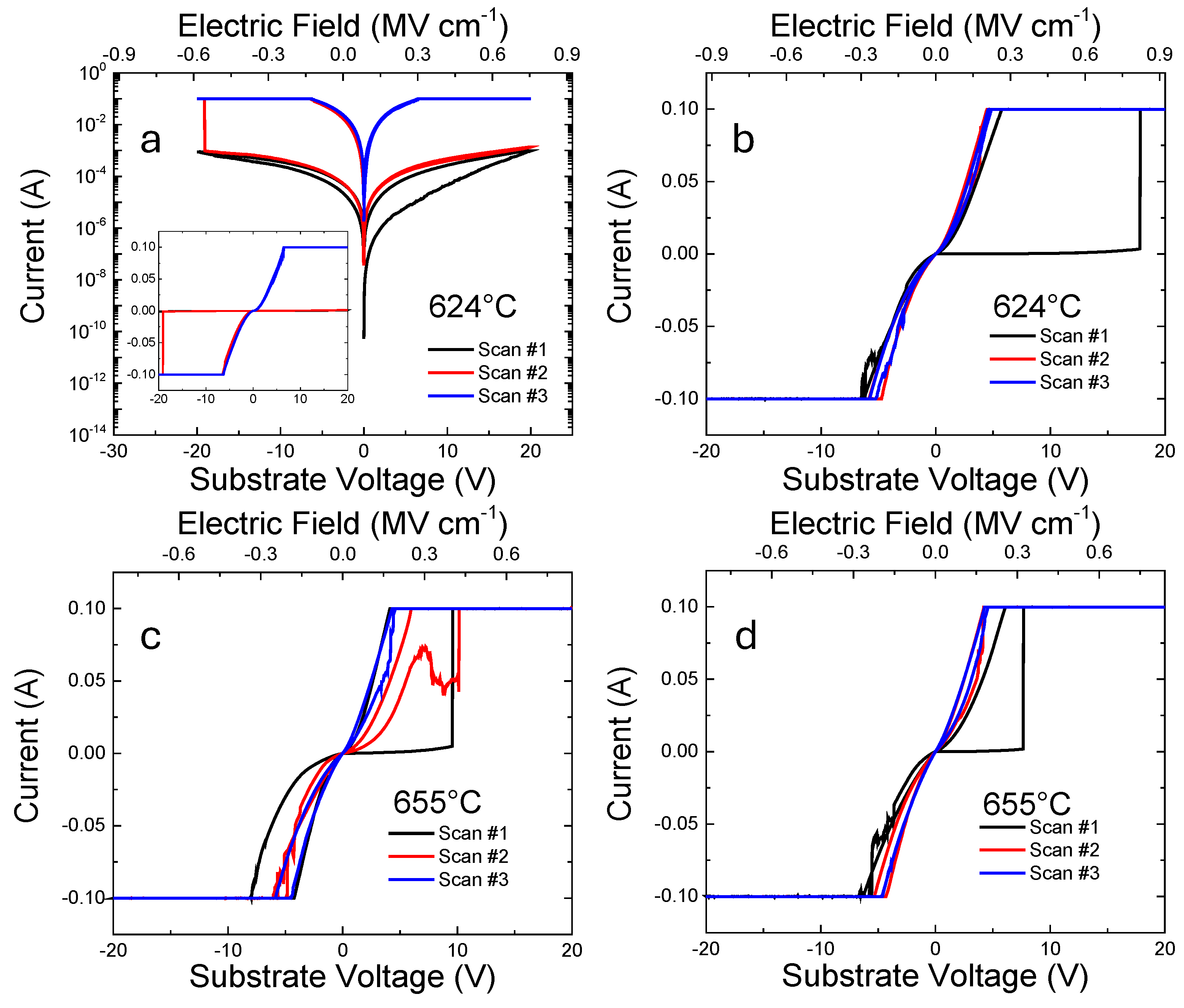 xN films. For growth temperatures of 624 °C and 655 °C, several devices exhibit an irreversible increase in current beyond a certain threshold voltage. In