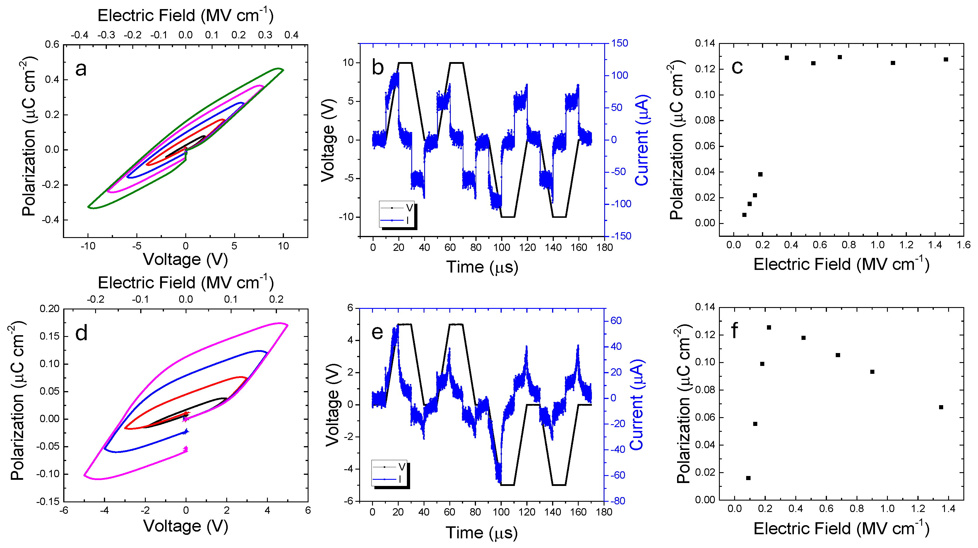r. Finally, the electrical leakage increases significantly when the applied electric field approaches 0.2–0.3 MV/cm, at which point the polarization saturates; on the other hand, some works report higher coercive fields~2–4 MV/cm [