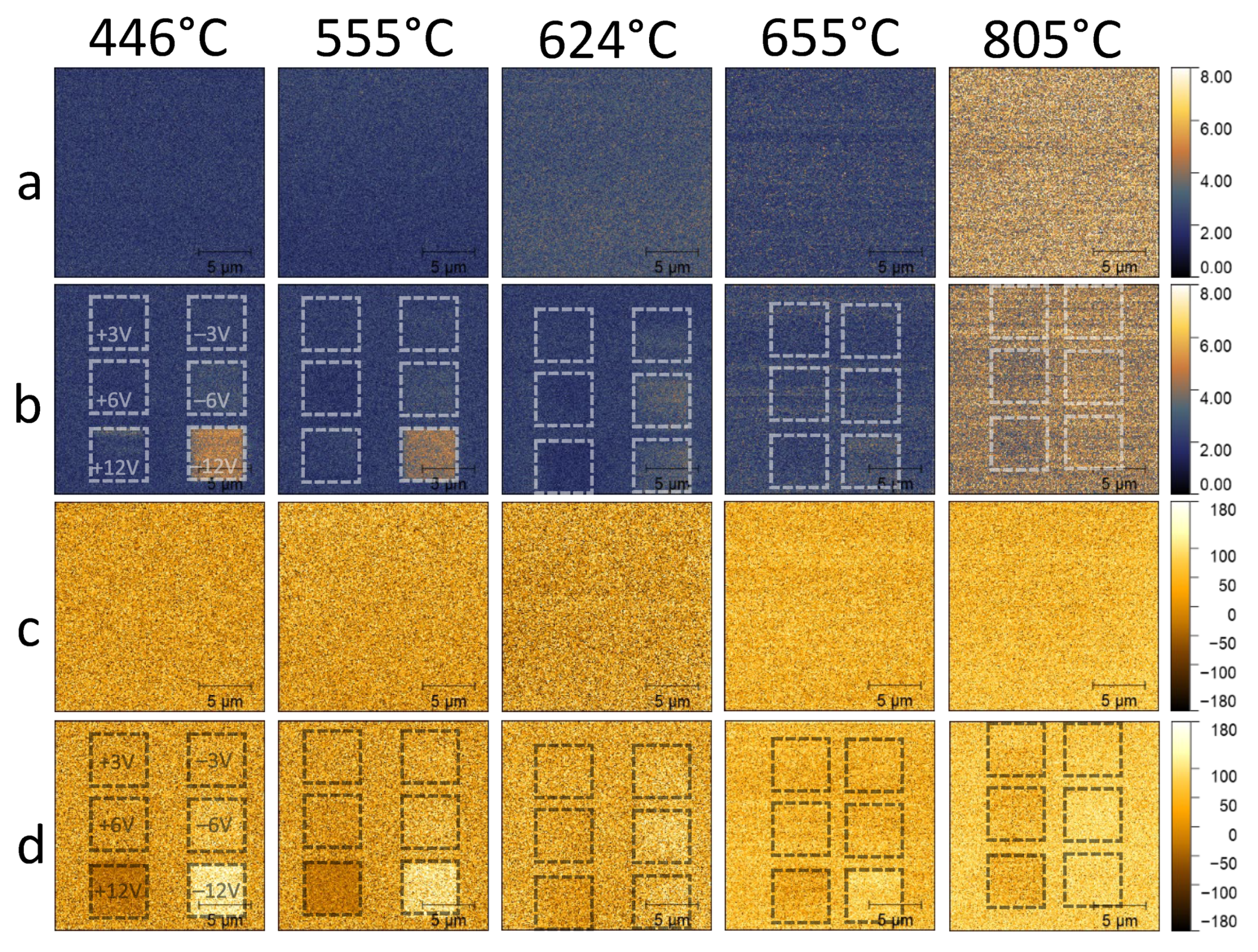 Figure 8 shows piezoresponse measured in low voltage mode, in which the maximum tip bias in the AFM is ±12 V, limiting the electric field in the Al